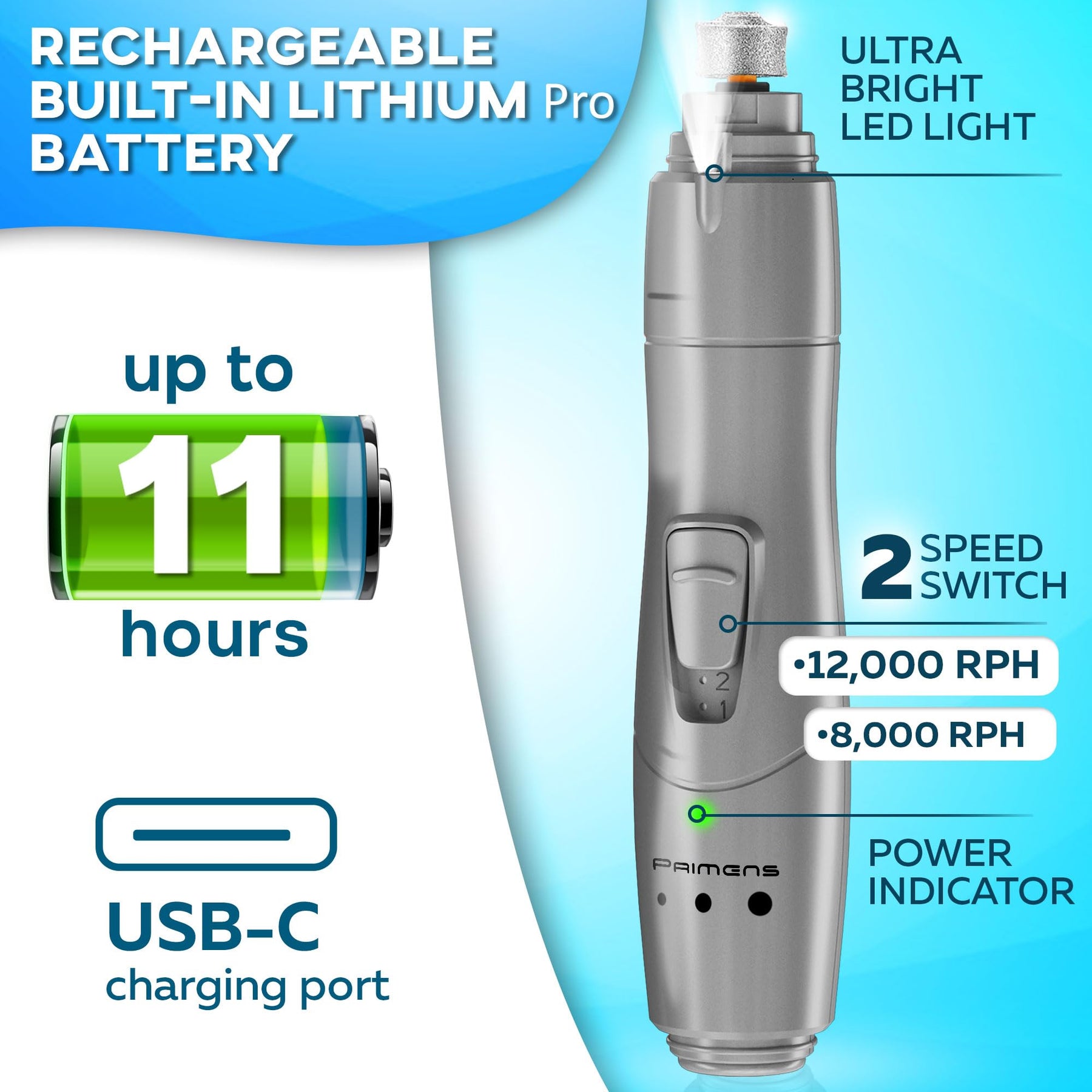 - Forget about low battery after the first use or even worse - during the nail trimming process. Our rechargeable dog nail grinder works up to 11 hours on a single charge. Because it’s cordless, you can use this electric dog nail grinder from anywhere. Find the place where your pet feels safe and comfy, and finally do that trimming thing without stress.