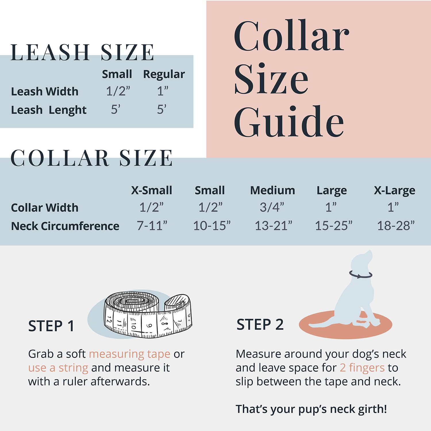 - LOOKING FOR A MATCHING COLLAR+LEASH SET TO USE ON WALKS We’ve got you covered. And you’re going to love the bright, colorful options! Many of our beautiful collars have matching leashes that are perfect for dog walking and hiking. Leashes are 5 feet long, with a comfortable, soft hand loop that keeps you in control of your pooch. Leashes come in two widths and can be purchased as a collar+leash combo or separately. Browse our Amazon store for more options.