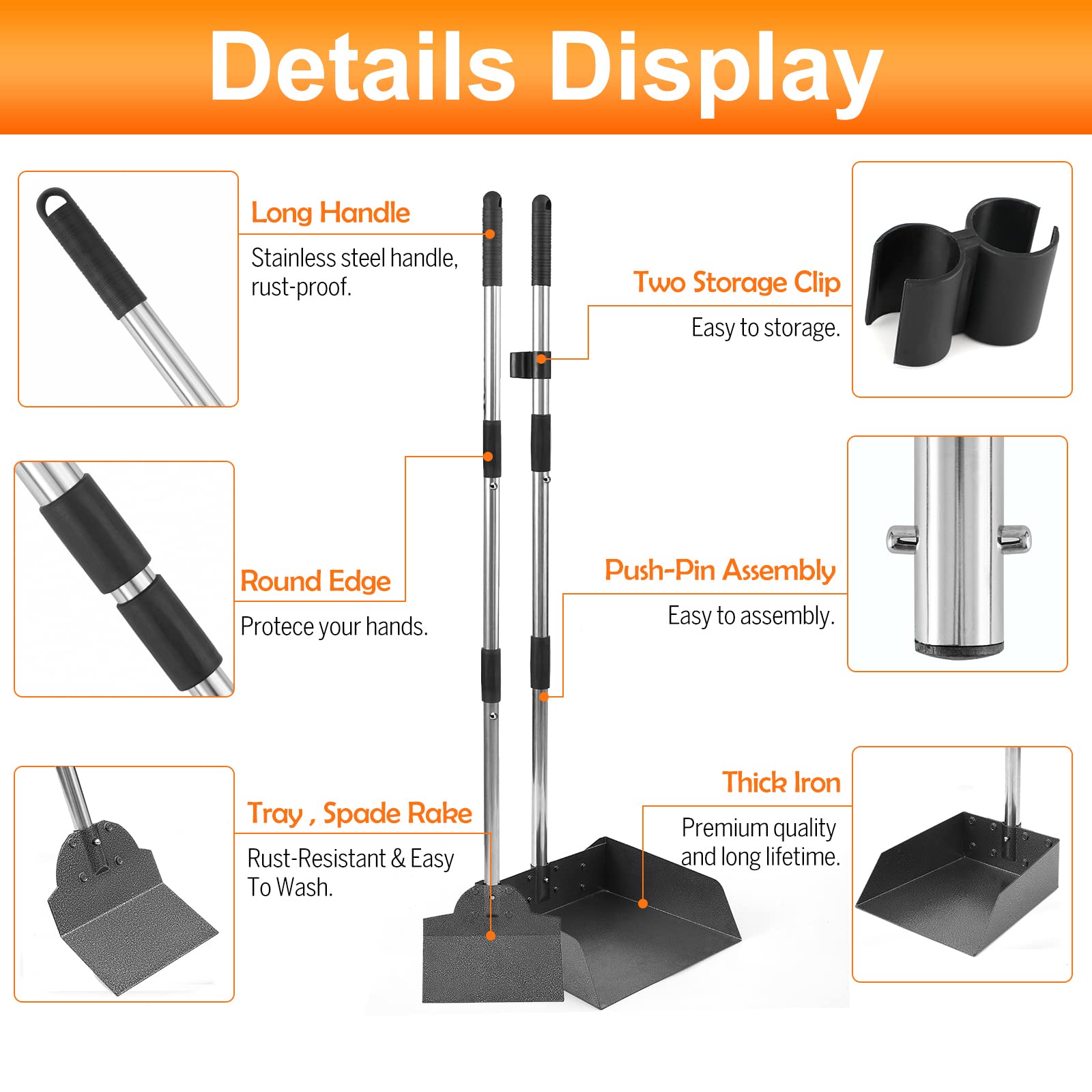 - MultipurposeYou can combine the rake and dustpan to clean up the dog poop at home or in the yard, also a perfect tool rake for lawns, grass, dirt and gravel. A spade and dustpan combination to clean up garbage on the ground and to level the ground and dog kennels, keep them clean. Owning a pooper scooper no more countless plastic bags, and are friendly to the environment.