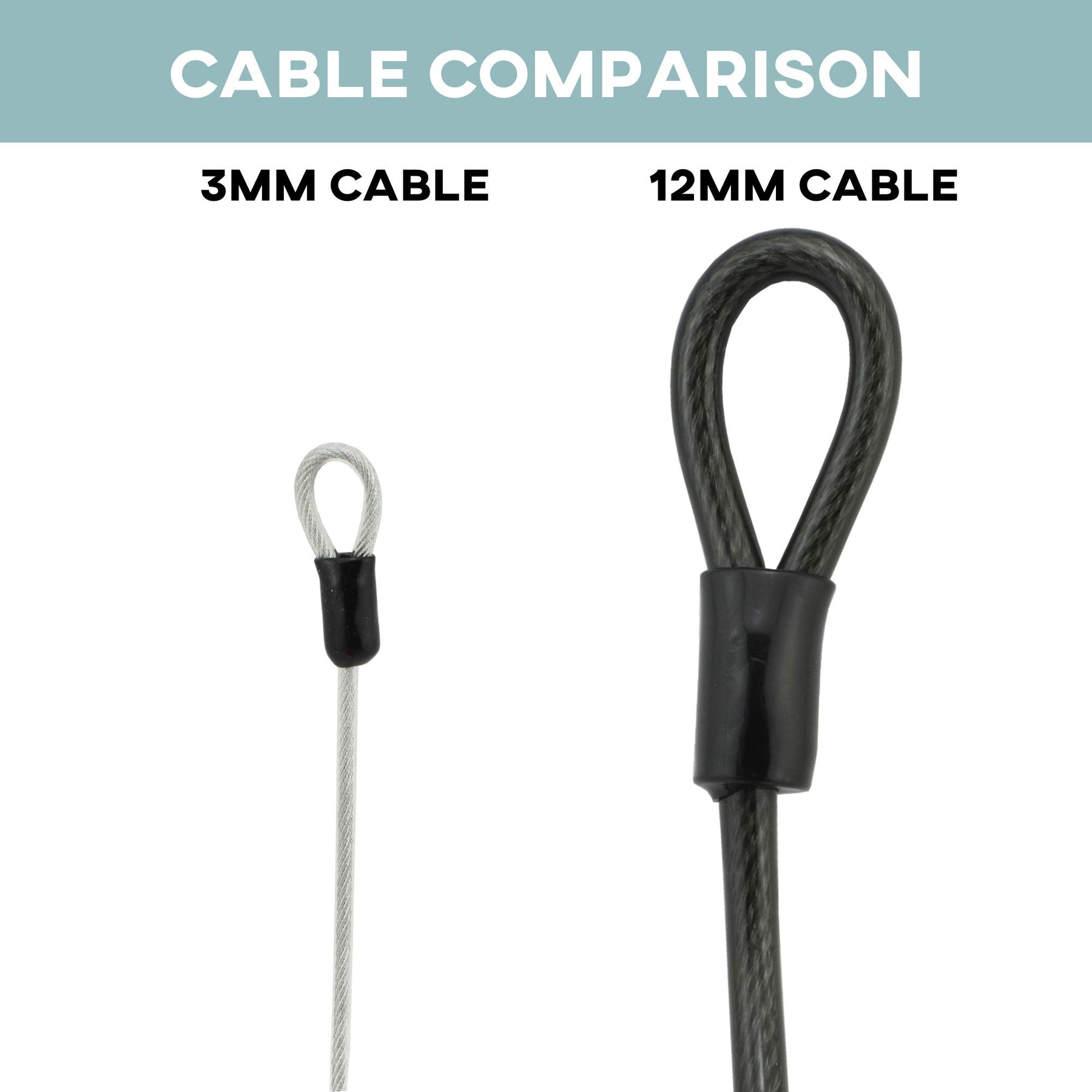 - Braided steel construction provides strength and flexibility. NOTE: This is cable has a 3mm diameter, it is not a heavy duty cable, this is a thin flexible cable