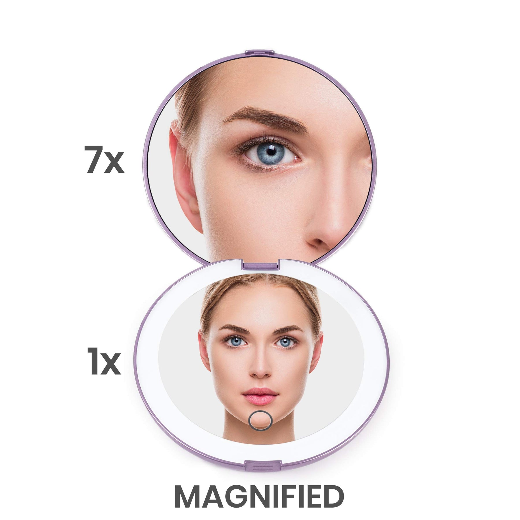 - 7X & 1X MAGNIFIED MIRROR - Being a 7X lighted makeup mirror with magnification, makes the Compact 2.0 the perfect cosmetic mirror for beauty touchups, eyebrow tweezing and other grooming needs.