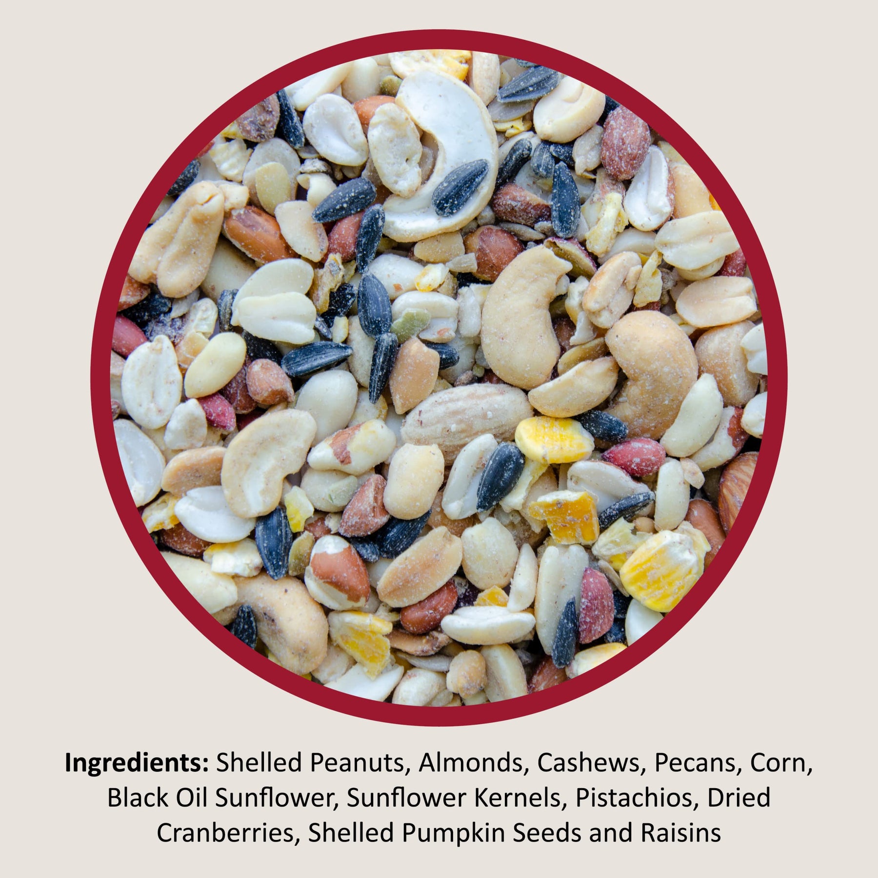 | special ingredients | Shelled peanuts, almonds, cashews, pecans, steamed crimped corn, black oil sunflower, sunflower kernels, valencia peanuts, pistachios, dried cranberries, shelled pumpkin seeds and raisins. |