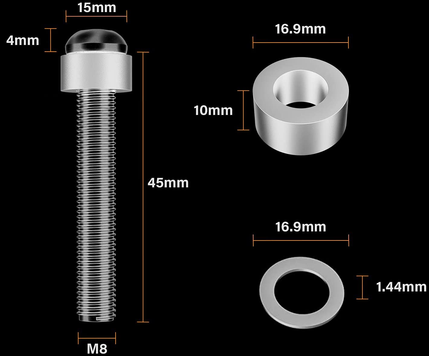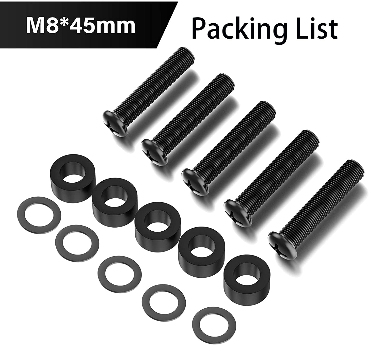 - Metric M8 machine screws with 1.25mm threaded pitch and 45mm threaded length, the included spacers is 8mm long, washer is 1mm in thickness.