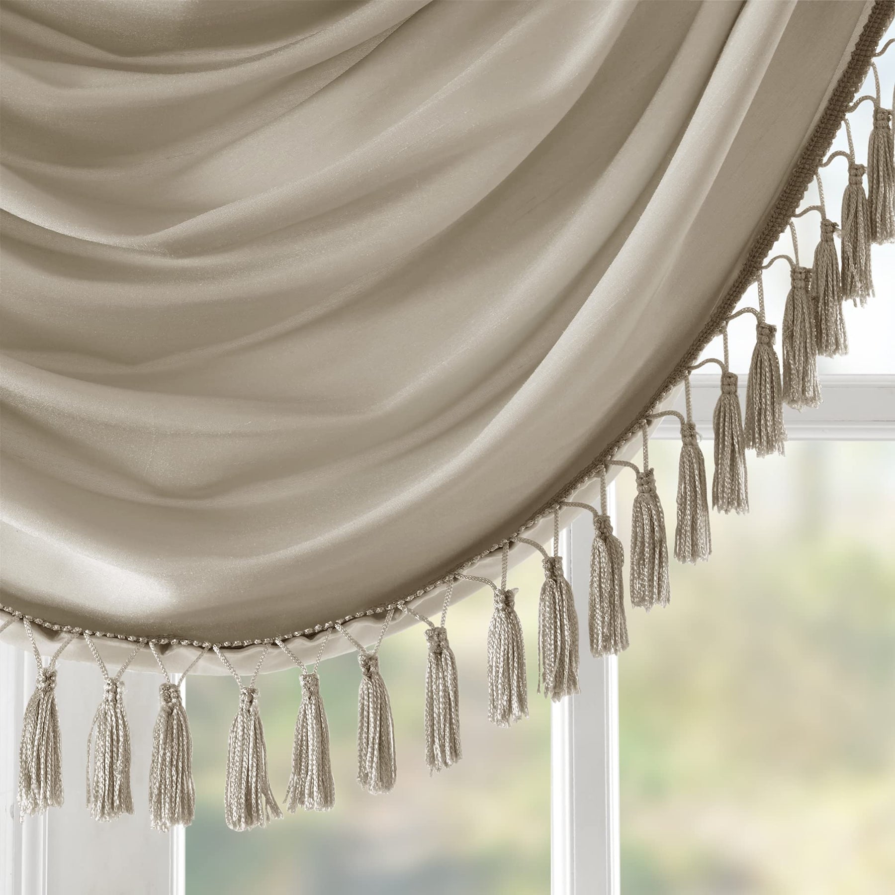 - Faux silk luxe light sheen fabric Center waterfall drape design Tassel Trim embellishment detailing Added lining for finish touch