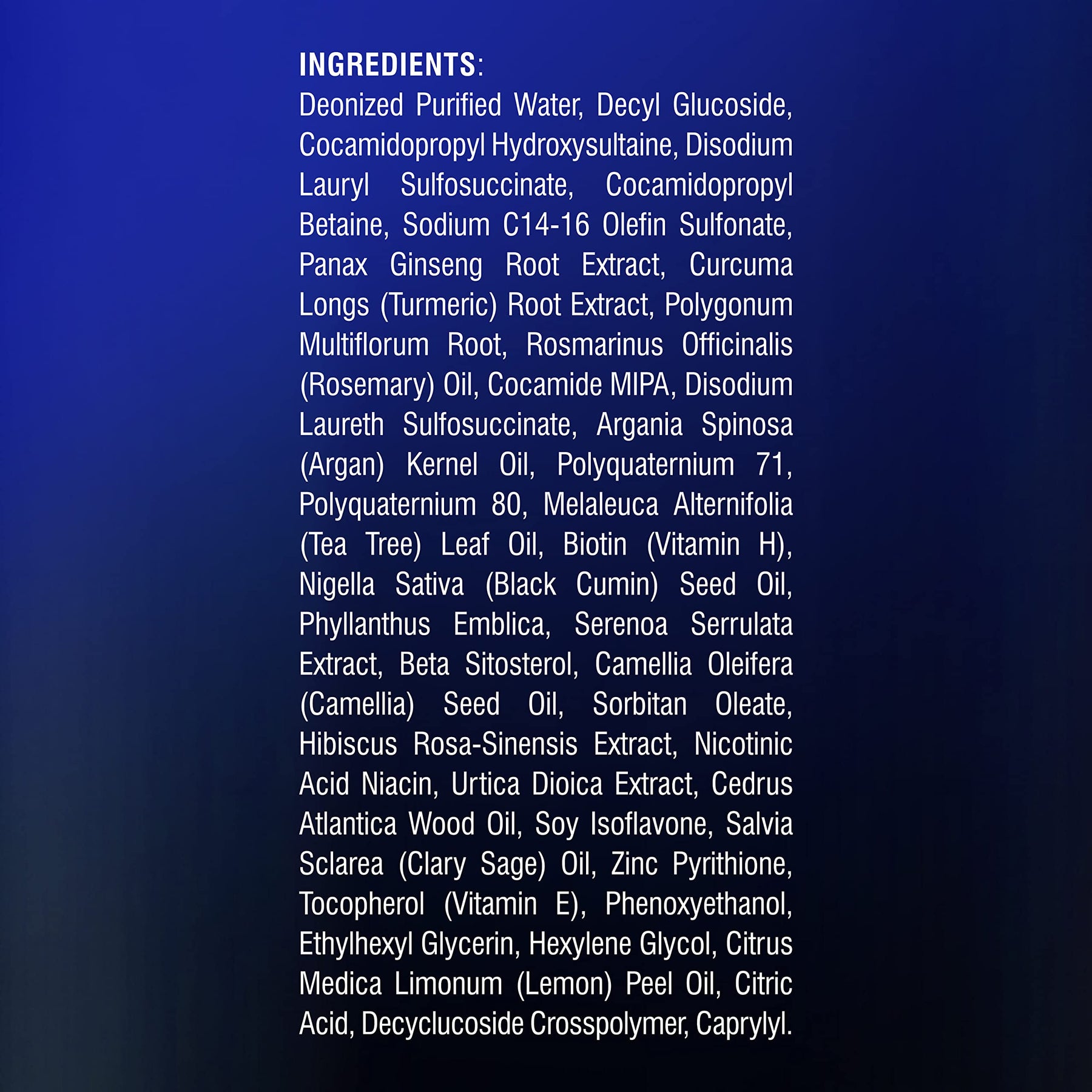 | ingredients | Deonized purified water, decylglucoside, cocamidopropyl, hydroxysultaine, disodium lauryl sulfosuccinate, cocamidopropyl betaine, sodium C14-16 olefin sulfonate, panaxginseng root extract, polygonum multiflorum rootrosmarinus officinalis (rosemary) oil, cocamide MIPA, disodium laureth sulfosuccinate, argania spinosa, (argan) kernel oil, polyquaternium 71, polyquaternium 80 melaleuca alternifolia (Tea tree) leaf oil, biotin (vitamin H) nigelia sativa, (Black cumin) seed oil, pyllanthus emblica, serenoa serrulata extract beta sitosterol, camellia oleiferia, (camellia) seed oil, sorbitan oleate, hibiscus, rosa sinesis extract nicotinic acidniacin urtica dioica extract, cedrus atlantica wood oil, soy isoflavone, salvia sclarea (clary sage) Oil, Zinc pyrithione, tocopherol (vitamin E) phenoxyethanol, Ethylhexyl glycerin, hexylene glycol, citrus medica limonum (lemon) Peel oil, citric acid, decyclucoside crosspolymer, caprylyl |