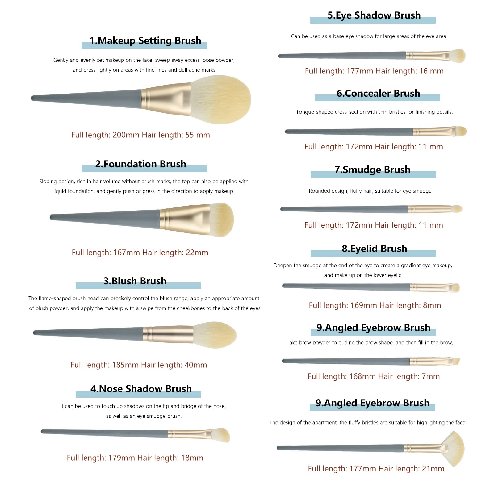 - ALL YOU NEED - This 10 pcs brush set includes a powder brush, a foundation brush, a concealer brush, a highlighter brush, a blush/contour brush, a lip brush, an eyebrow brush, an eyeliner brush, an angled brush, and an eyeshadow brush.