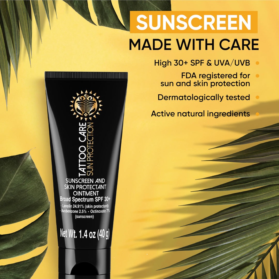 - TATTOO SUN PROTECTION - Available in two sizes 1.4 and 2.8 Oz.! Made especially for inked skin. 30+ SPF and Broad-Spectrum UVA/UVB light protection. Deeply moisturizes and nourishes skin. Protects tattoo colors from looking faded.