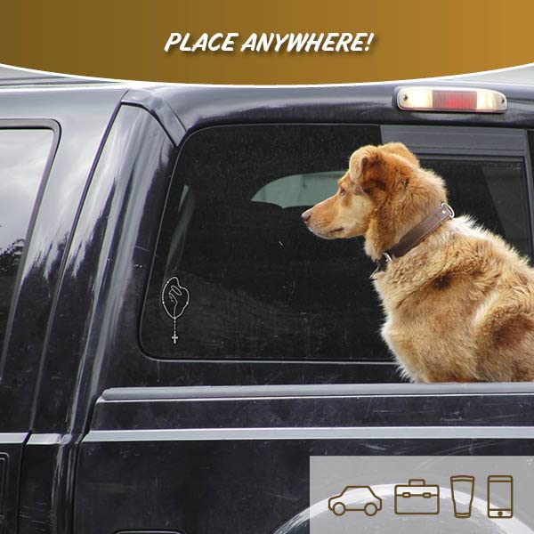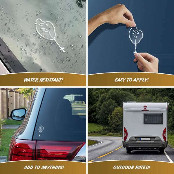 - Simple Peel And Stick Application – Our Mary Rosary decals for cars are easy to apply, simply peel and stick! No need to mess with difficult transfer tape. Our Mary car decals are each one solid piece that feature UV rated ink on clear outdoor vinyl that is contour cut to follow the curves of the artwork. Clean and dry application area thoroughly, press decal on desired location, apply pressure from center to edges.
