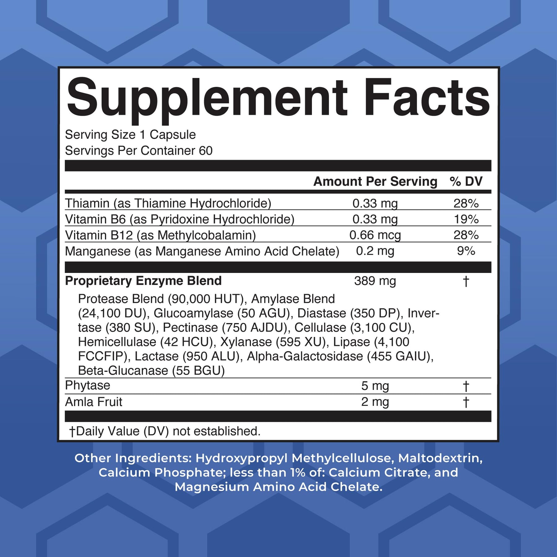 - Vegan Formula: We include more of every enzyme that can help you feel your best: Protease, Amylase, Glucoamylase, Diastase, Invertase, Pectinase, Cellulase, Hemicellulase, Xylanase, Lipase, Lactase, Alpha-Galactosidase, and Beta-Glucanase. Our enzymes also include Vitamin B1, B6, B12, Calcium, Magnesium, Manganese, Amla, and Phytase. Other Ingredients: Hypromellose, Maltodextrin, Calcium Phosphate.