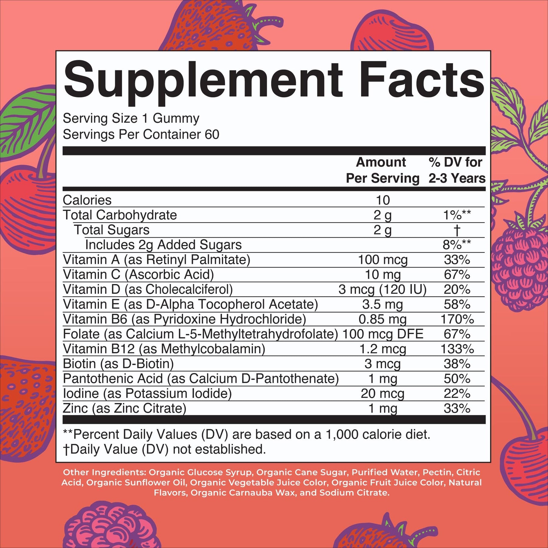 - Organic Toddler Multivitamin Gummies: With Vitamin A, C, D3, a blend B Vitamins, Iodine, Zinc, and more, you can feel confident that your toddler is getting nutrients and ingredients their body will benefit from with these delicious and pectin-based mixed berry and cherry-flavored multivitamin gummies.