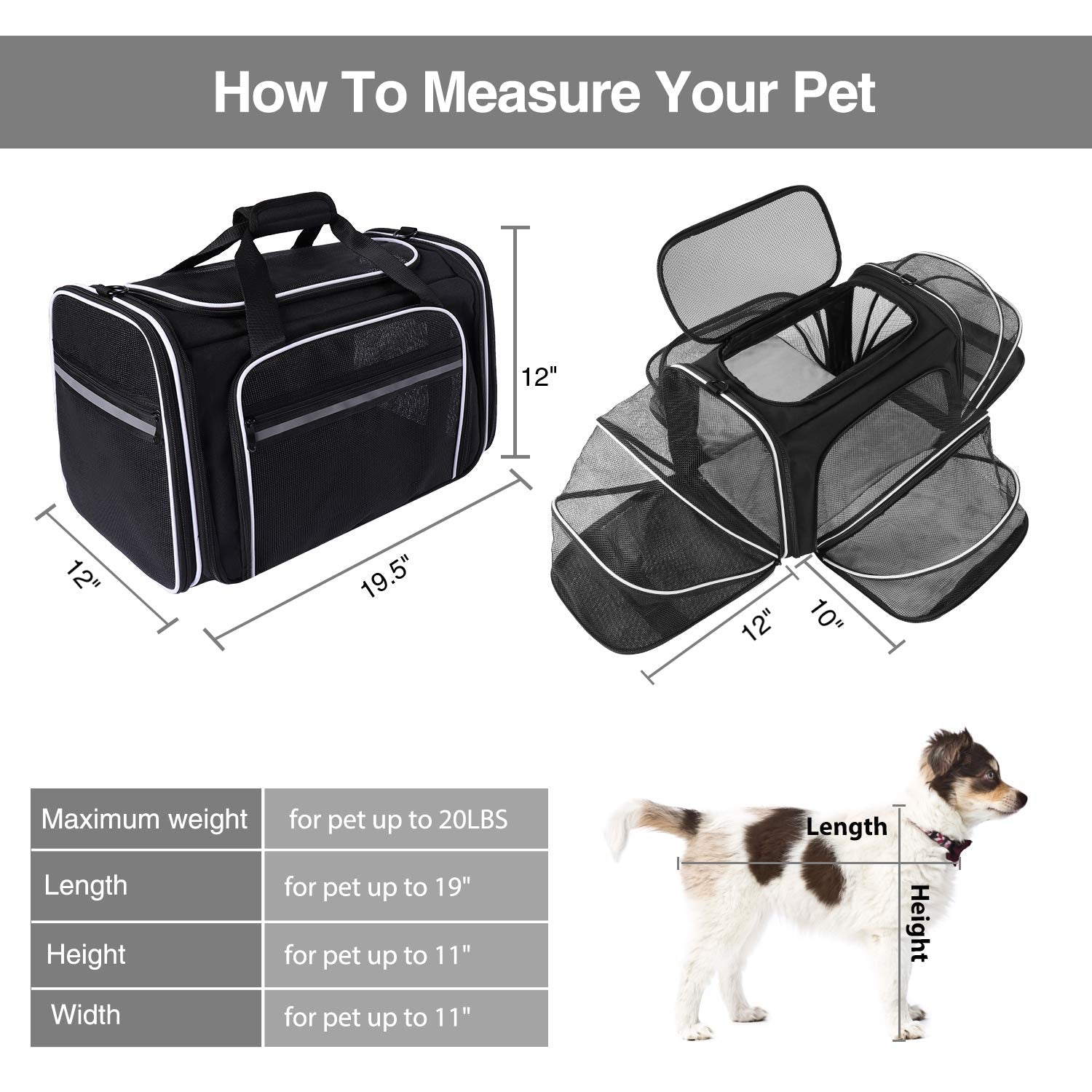 - Note Before Purchase: This large size travel carrier bag for dogs measures 19.5L x 12W x 12H (43.5L x 32W x 12H when 4 mesh windows fully expanding), which fits perfectly for small dogs/puppy/dog/cats/kitten, it can even take 2 cats inside. Fits Pets up to 19Lx11W x 11H. Then the max load of 20 lbs (9 kg). Please remember that preference should always be given to the size then the weight of your pet.