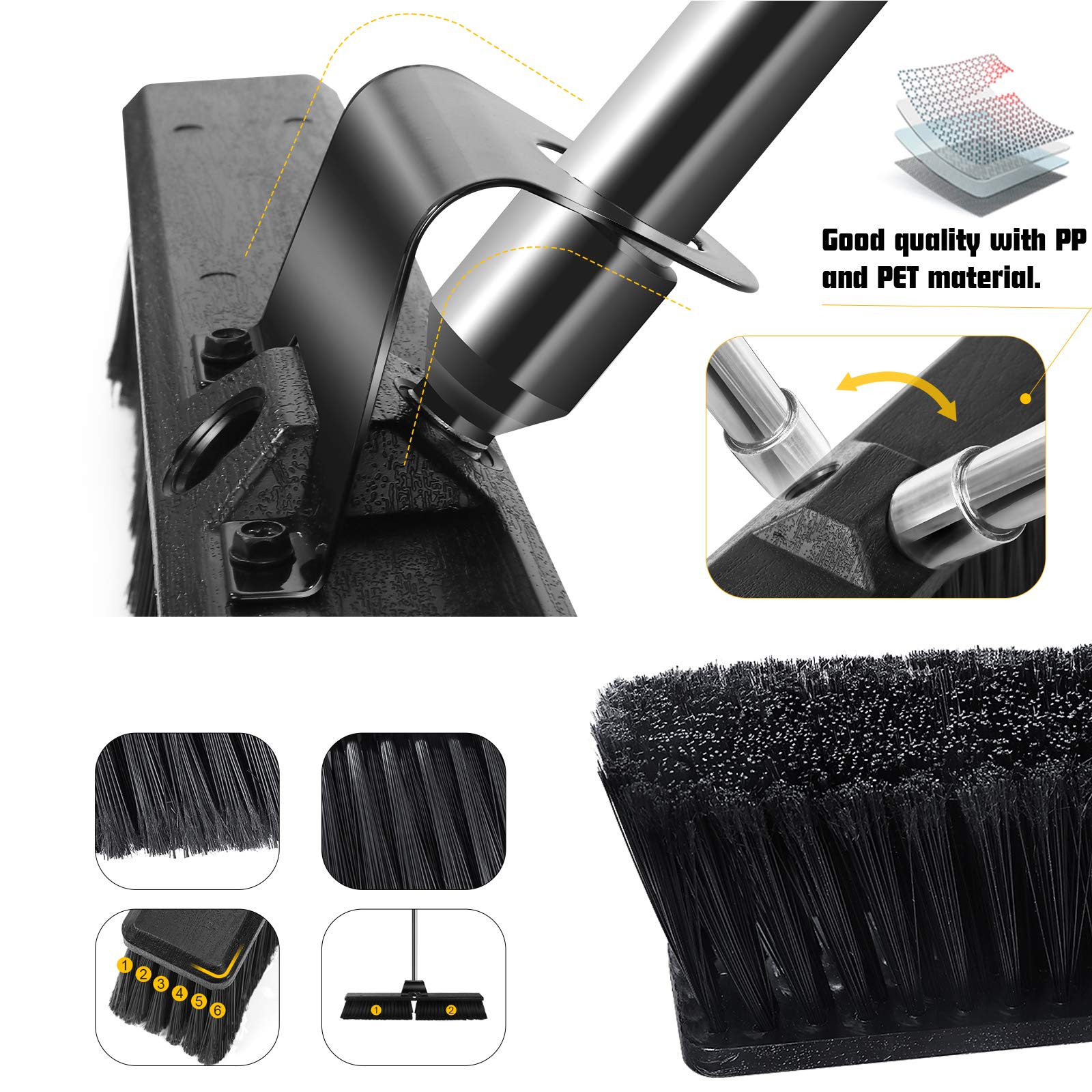 - HIGH QUALITY - The broom handle is made of high-strength stainless steel, the threaded end is firmly embedded in the broom head, making it not easy to loosen during use. The heavy duty plastic brush head is resistant to cracking or warping to provide long-term use. The brush head has handle insert holes on both sides, when the bristles on one side are worn, it can be switched to the other side of the brush head for long-lasting performance.