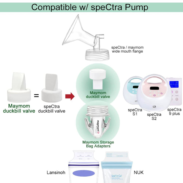 - Original Breastfeeding – Breastmilk Storage Bag Adapters Compatible with Spectra S1, S2 Pumps ; 2 Duckbill Valves Included; Clear BPA Free Material; Boiling Water OK; Do Not Use Microwave or Steamer Bag to Sanitize by Maymom