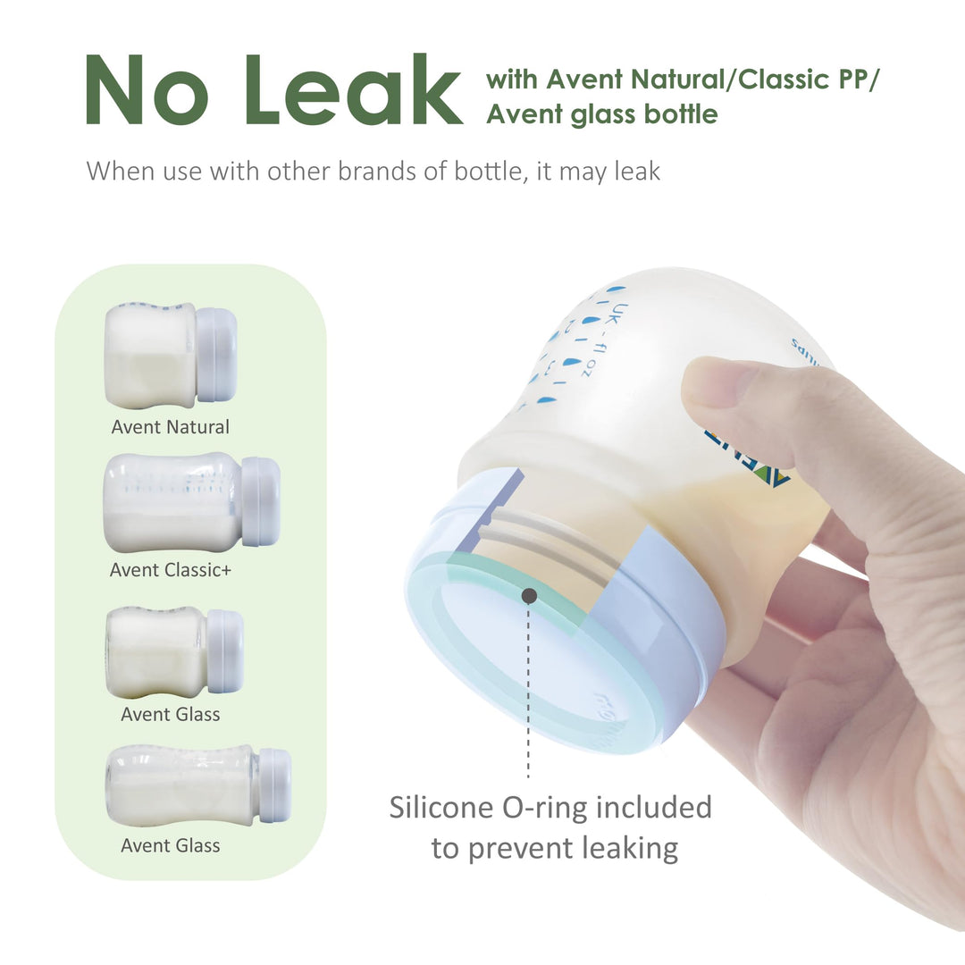 - Contains 6 sealing caps or travel caps; compatible with Avent Natural Polypropylene bottles, Avent Natural Glass bottle, Avent Classic bottles and Maymom wide-neck bottles. Each cap contains 1 silicone sealing ring to prevent leaking. NOTE: if you use it with spectra bottles, DO NOT over tighten it. In this case, it will leak.
