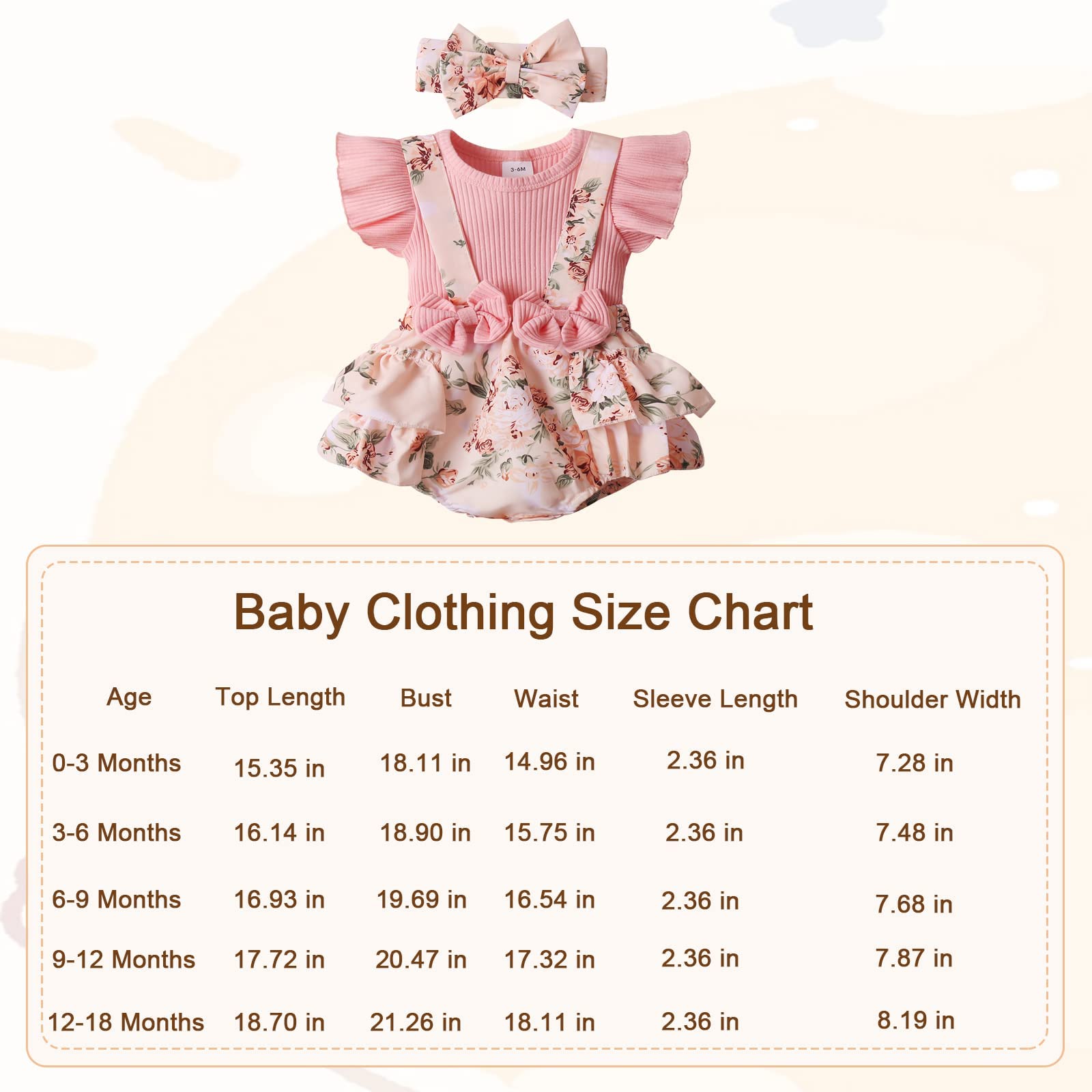 - [Size Options] Please kindly refer to the size chart in the product description before you buy the item. Suitable for 0-3 months baby girl clothes, 3-6 months baby girls’ clothing, 6-12 months infant girl clothes, 12-18 months newborn girl romper bodysuit. Your baby will love cute clothes. It be a meaningful gift for your baby girl, your granddaughter, niece, etc.