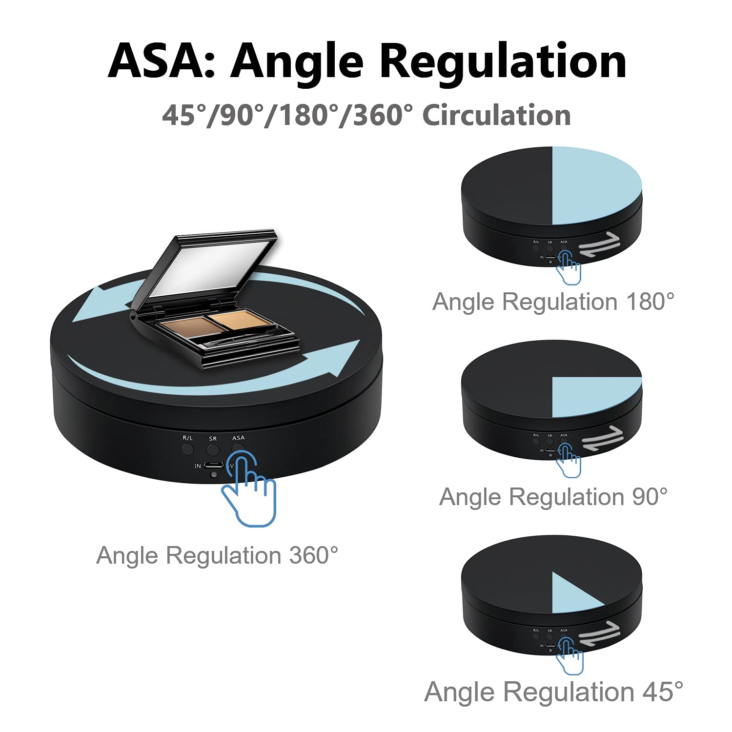 -You can control the speed and adjust direction or angle. R/L: switch to clockwise or counterclockwise; SR: speed regulation, 2r/4r/6r per min; ASA: angle regulation,45°/90°/180°/360° circulation. The load-bearing capacity is about 2-4kg (depends on speed selected).