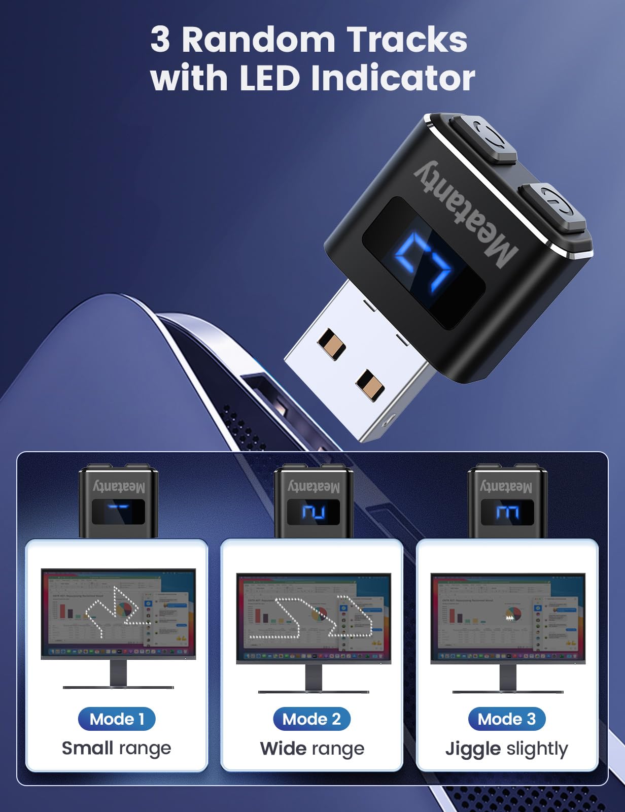 - 3 Random Tracks with LED ScreenOur auto mouse mover has 3 random tracks to choose from. mode 1 is small range of movement, mode 2 is wide range of movement. In Mode 3, the cursor just jiggles slightly, so Mode 3 will NOT affect your normal use of the mouse. Another exclusive design makes our mouse wiggler outstanding other brands is the LED Screen. It allows you to tell from LED display whether the device is running and which track it’s in.