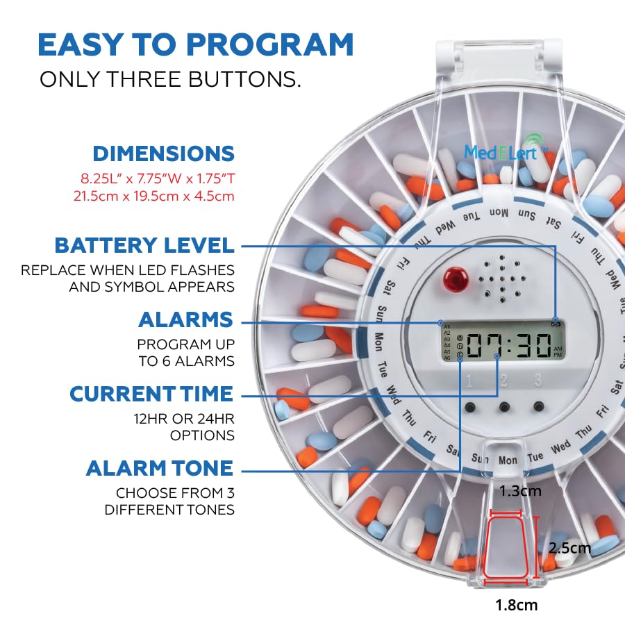 - Customizable Medication Dispenser: The Med-E-Lert Automatic Pill Dispenser offers six dosage rings, allowing you to organize your medications effortlessly. Perfect for daily use, this medication dispenser supports up to 28 doses, ensuring consistent and accurate dosing.