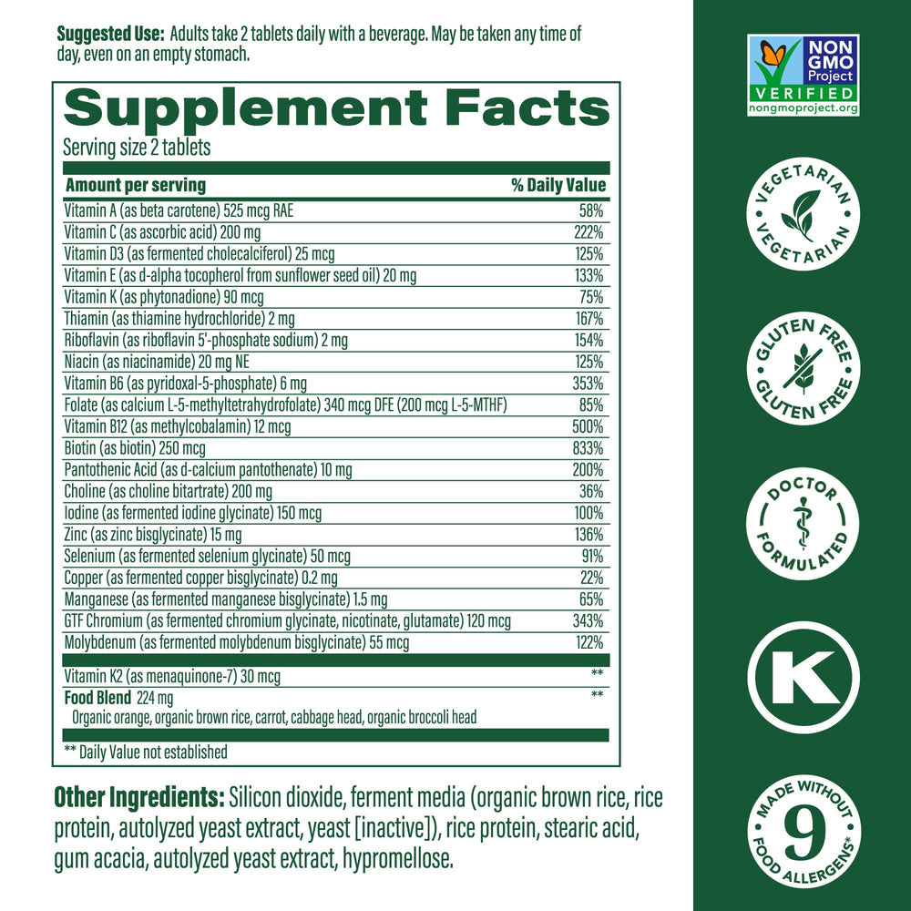 | ingredients | Vitamin A (as beta carotene) 525 mcg RAE, Vitamin C (as ascorbic acid 200 mg, Vitamin D3 (as fermented cholecalciferol) 25 mcg, Vitamin E (as d-alpha tocopherol from sunflower seed oil) 20 mg, Vitamin K (as phytonadione) 90 mcg, Thiamin (as thiamine hydrochloride) 2 mg, Riboflavin (as riboflavin 5'-phosphate sodium) 2 mg,Niacin (as niacinamide) 20 mg, NE Vitamin B6 (as pyridoxal-5-phosphate) 6 mg, Folate (as calcium L-5-methyltetrahydrofolate) 340 mcg DFE (200 mcg L-5-MTHF), Vitamin B12 (as methylcobalamin) 12 mcg, Biotin (as biotin) 250 mcg, Pantothenic Acid (as d-calcium pantothenate) 10 mg, Choline (as choline bitartrate) 200 mg ,Iodine (as fermented iodine glycinate) 150 mcg, Zinc (as zinc bisglycinate) 15 mg, Selenium (as fermented selenium glycinate) 50 mcg,Copper (as fermented copper bisglycinate) 0.2 mg, Manganese (as fermented manganese bisglycinate) 1.5 mg, GTF Chromium (as fermented chromium glycinate, nicotinate, glutamate) 120 mcg, Molybdenum (as fermented molybdenum bisglycinate) 55 mcg, Vitamin K2 (as menaquinone-7) 30 mcg ,Food Blend Organic orange, organic brown rice, carrot, cabbage, organic broccoli 224 mg,Other Ingredients: Silicon dioxide, ferment media (organic brown rice, rice protein, autolyzed yeast extract, yeast inactive), rice protein, stearic acid, gum acacia, autolyzed yeast extract, hypromellose. |