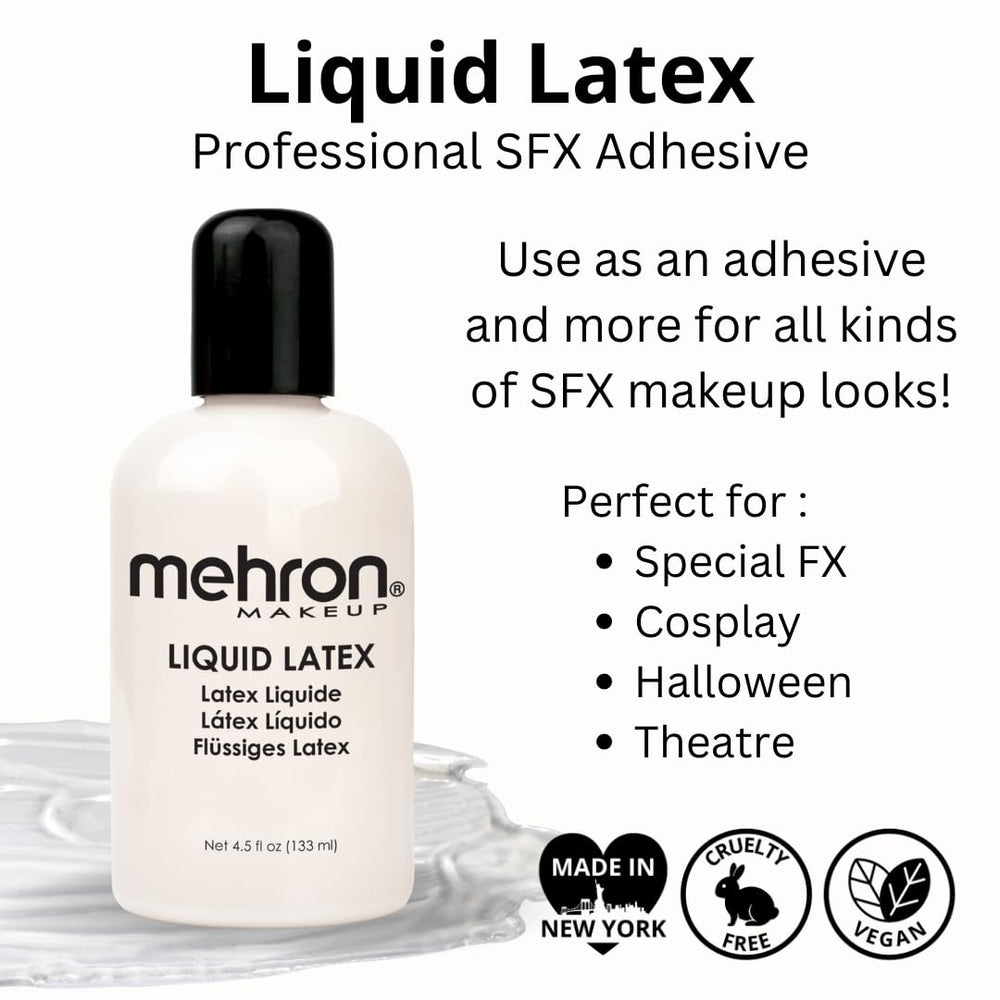 - PROFESSIONAL: Mehron's Liquid Latex is a professional, vegan formula that can be used as an adhesive to attach appliances to the skin, to seal wax, or to create textured effects like aged or peeling skin. True professional grade, trusted by Hollywood and Broadway pros since 1927.