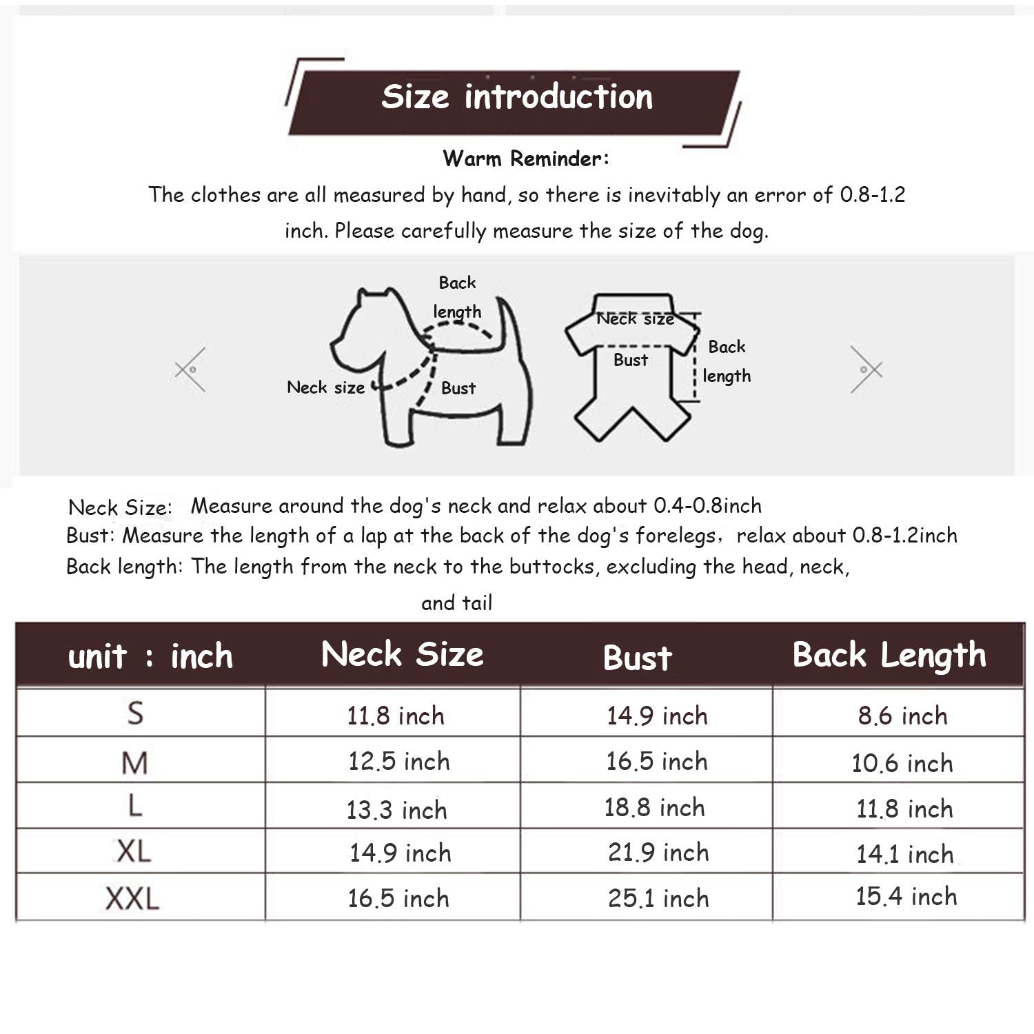 Please note: Every measurement should be a little loose, more convenient for dog activities.