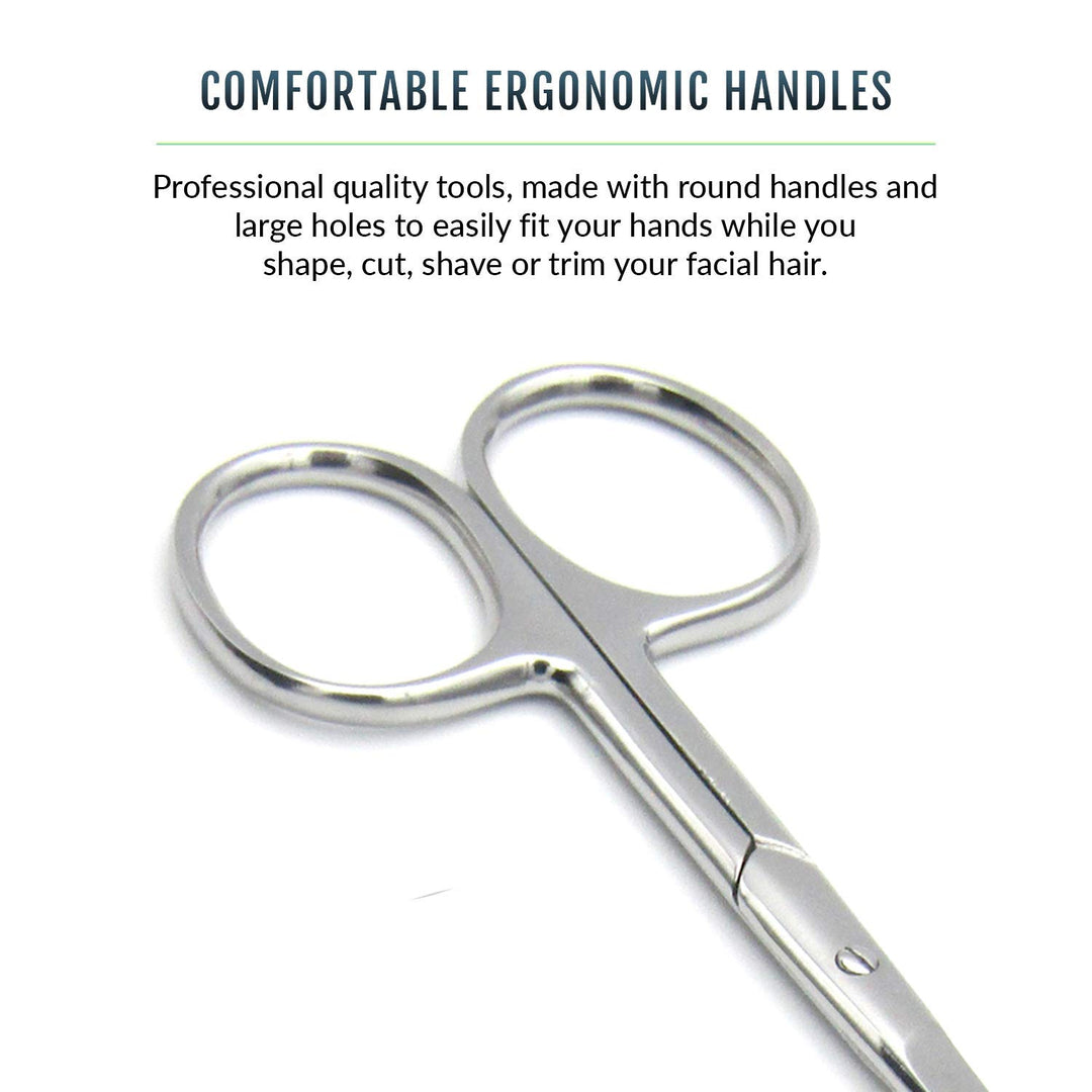 - [ TWIN PACK ] - 2-PC complete set of premium facial hair scissors for all types of your facial grooming needs, rounded and curved shapes scissors are perfect for eyebrows, noses, Moustache, Beard Trimming, baby nails, and any body hair.