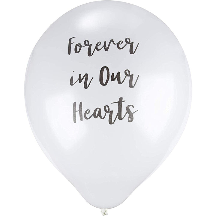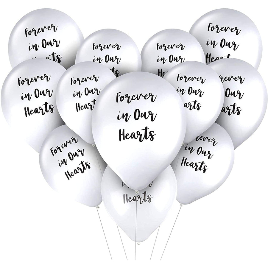 - 30 WHITE FUNERAL BALLOONS: These classy white Forever in our hearts balloons are a simple, beautiful, and affordable way to add a personal touch to a funeral, memorial, celebration or life, or mark the anniversary of a loved one's passing