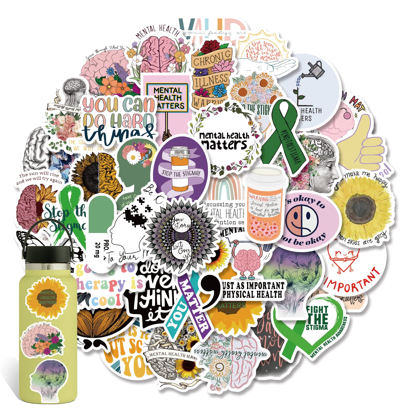 - Original Decals – Mental Health Awareness Stickers, 52Pcs Vinyl Waterproof Mental Health Decals for Hydro Flask, Water Bottle, Laptop,Skateboard, Computer,Phone by Bonitzdm