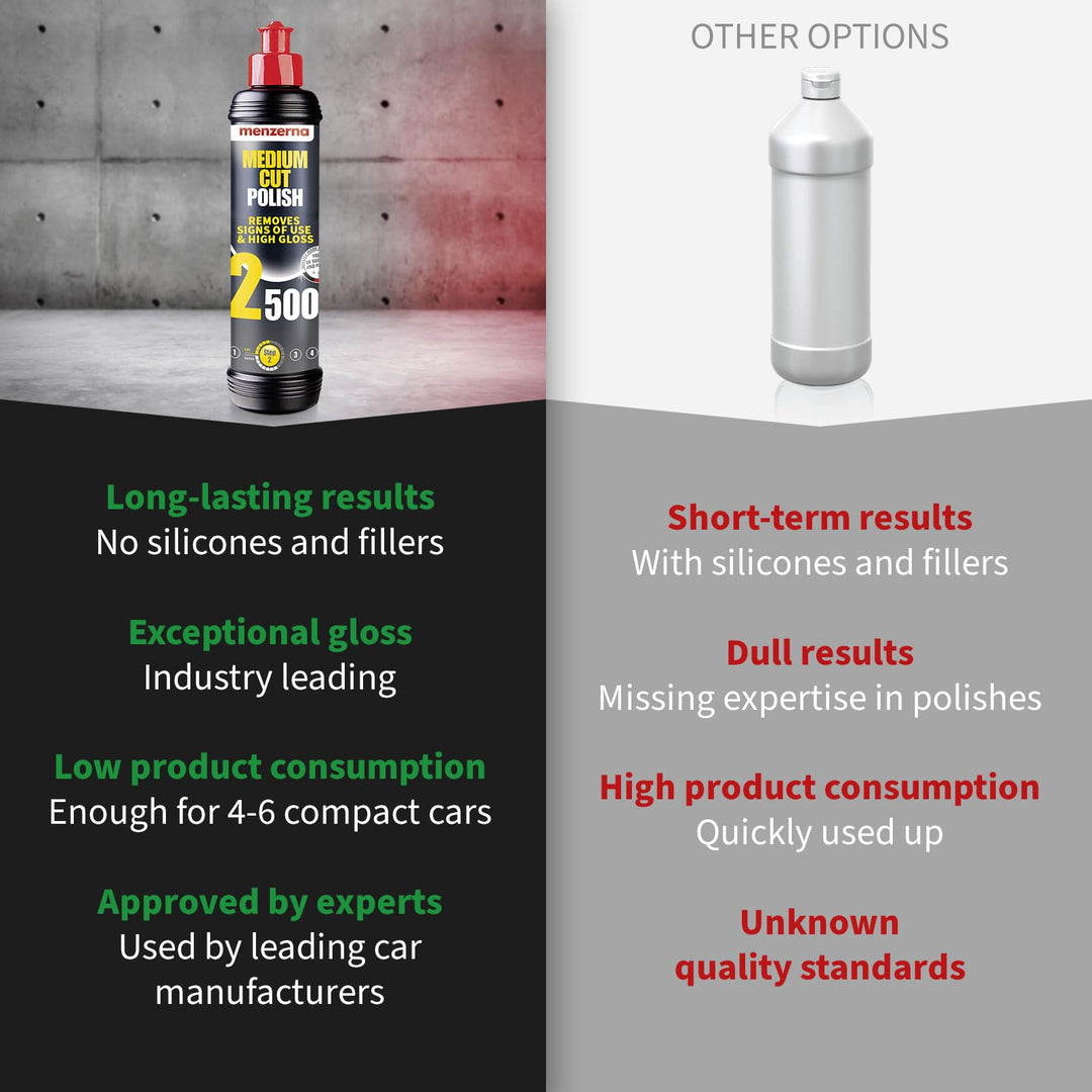 - POLISH LIKE A PRO: Our Menzerna Medium Cut Polish 2500 is compatible with our yellow Medium Cut Foam Pad. By using an orbital or a rotary polishing machine, your vehicle will be as smooth as it can get! For a quick fix, you can also polish with your hand.