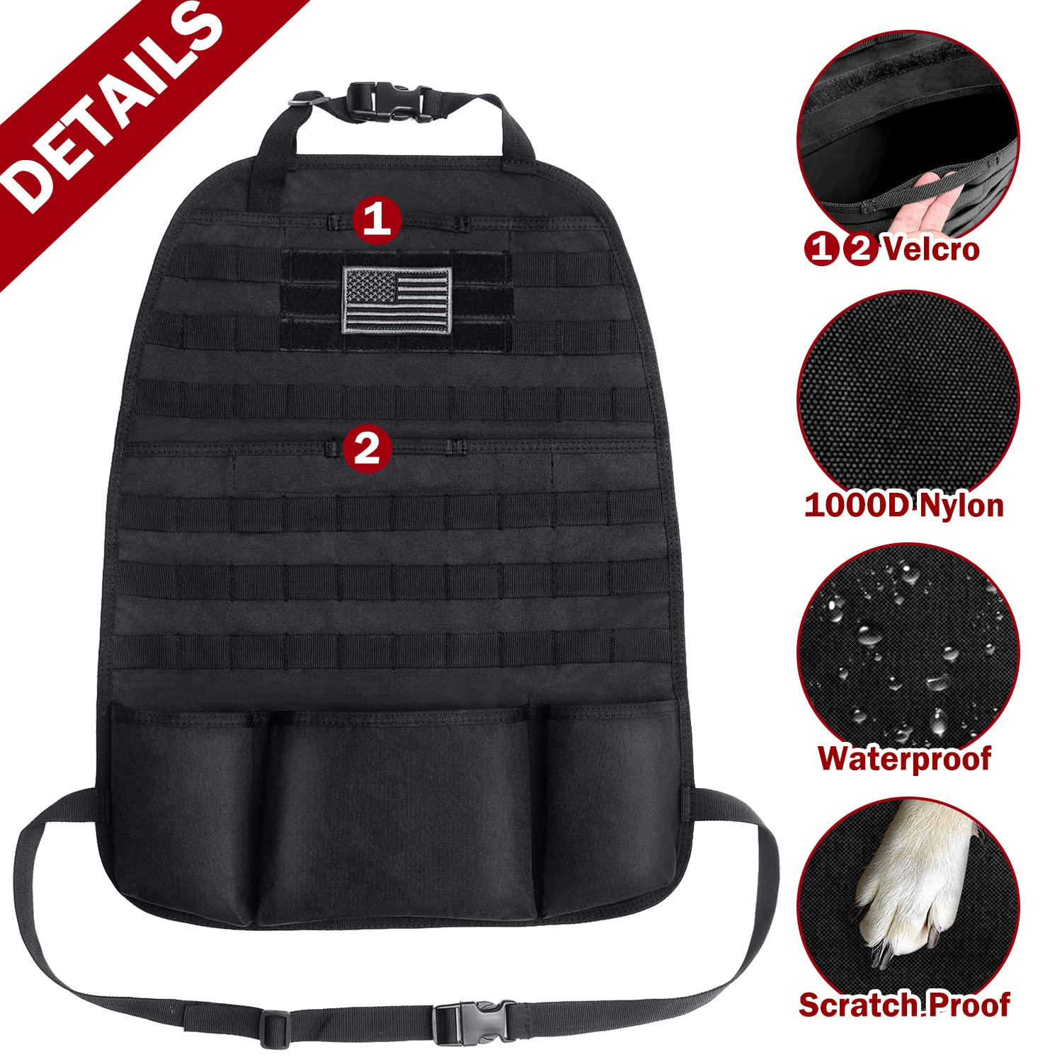 - Multiple StorageMEQI tactical seat back organizer with 2 hook and loop closure compartment. 2 inner pockets with velcro, a middle pocket in the upper and a large pocket in the lower. There are 2 pouches at the bottom for extra storage. Keep your back seat clean and tidy. No more worries for making your car messy on a family trip or to hunting. (Extra gift - flag patch)