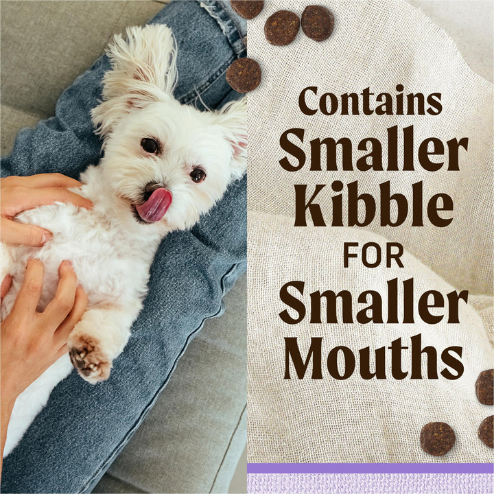 - Wholesome smaller-sized kibble is perfectly sized for small dog breeds and helps to clean teeth and freshen breath as they chew. Probiotics are added to support digestive health