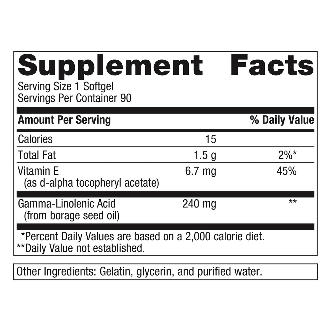 - Gamma-Linolenic Acid Supplement: Each softgel contains 240 mg of gamma-linolenic acid (GLA) derived from pure borage seed oil