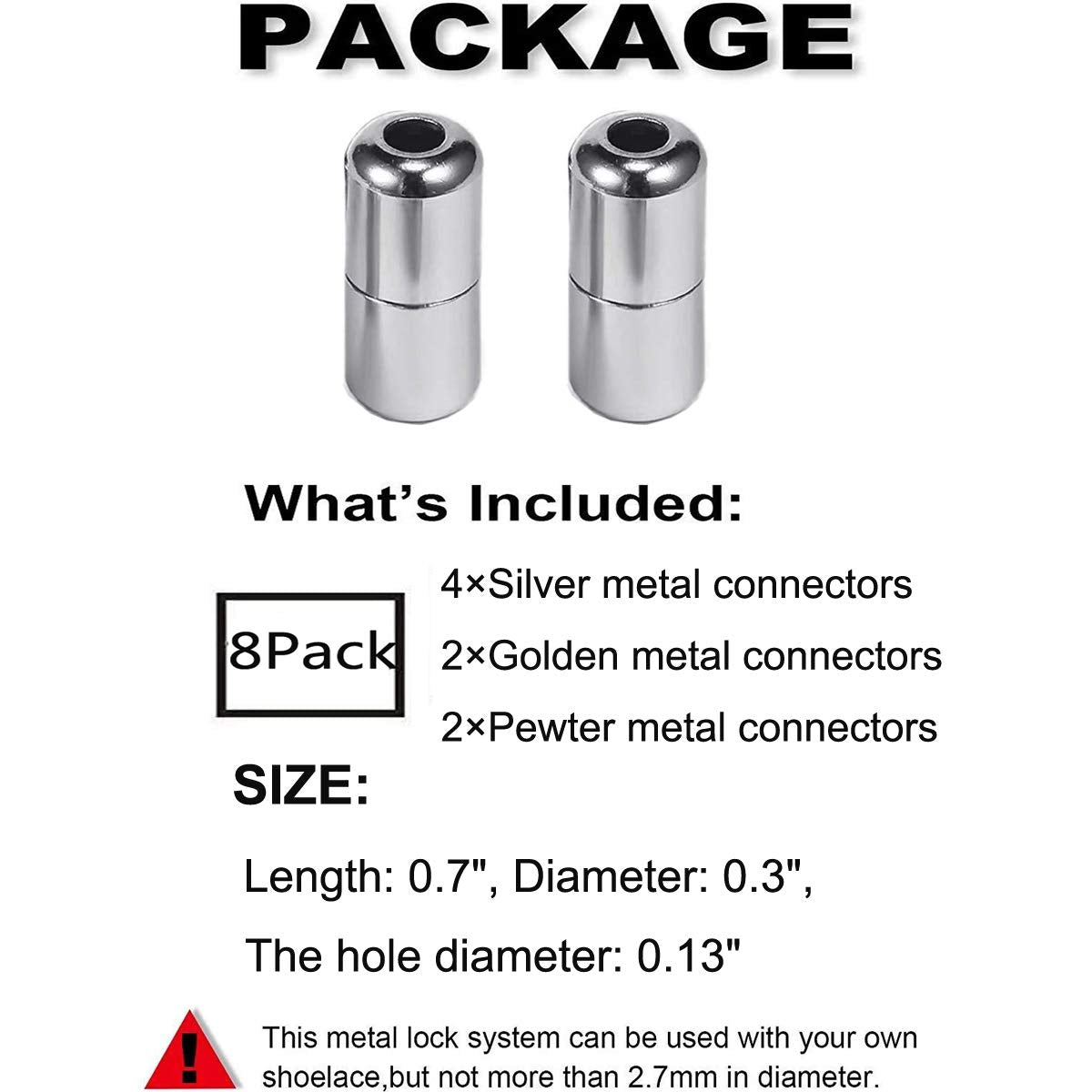 - What YOU GET: The package comes with 8 metal connectors,3 colors,4×Silver, 2×Golden, 2×Pewter,enough quantity for you to use and share with friends and families. They can work on boots, work shoes, tennis shoes, sneakers, casual shoes or any other shoes you have.
