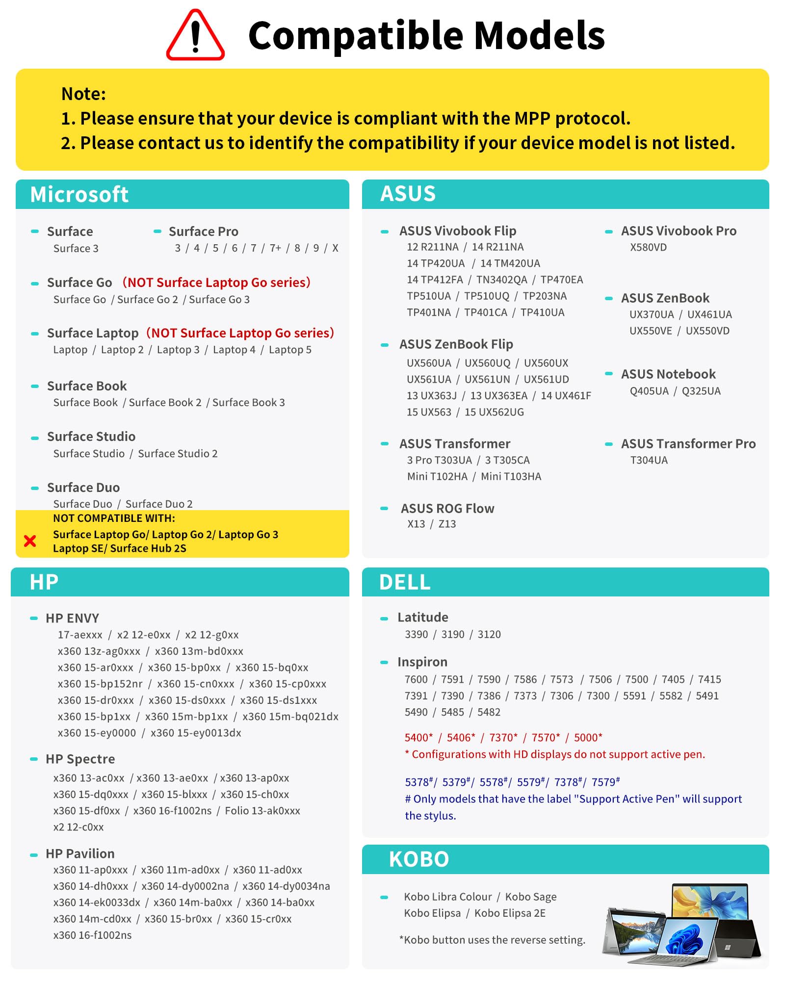 - ?Wide Compatibility?NOT work for Surface Laptop Go which is a different serie from Surface Laptop and Surface Go! Contat us via support@metapen.com with the model if you are not sure about the compatibility. M1 supports up to MPP1.15 protocol, compatible with most Microsoft surfaces and some models from HP, ASUS, DELL, Acer, SONY and ViewSonic. [Surface Model List] ?Surface Pro 3/Pro 4/Pro(5th Gen)/Pro 6/Pro 7/Pro 7+/Pro 8/Pro X, ?Surface Book/Bk 2/Bk 3, ?Surface Laptop/Laptop 2/Laptop 3/Laptop 4/Laptop Studio, ?Surface 3, ?Surface Go/Go 2/Go 3, ?Surface Studio/Studio 2
