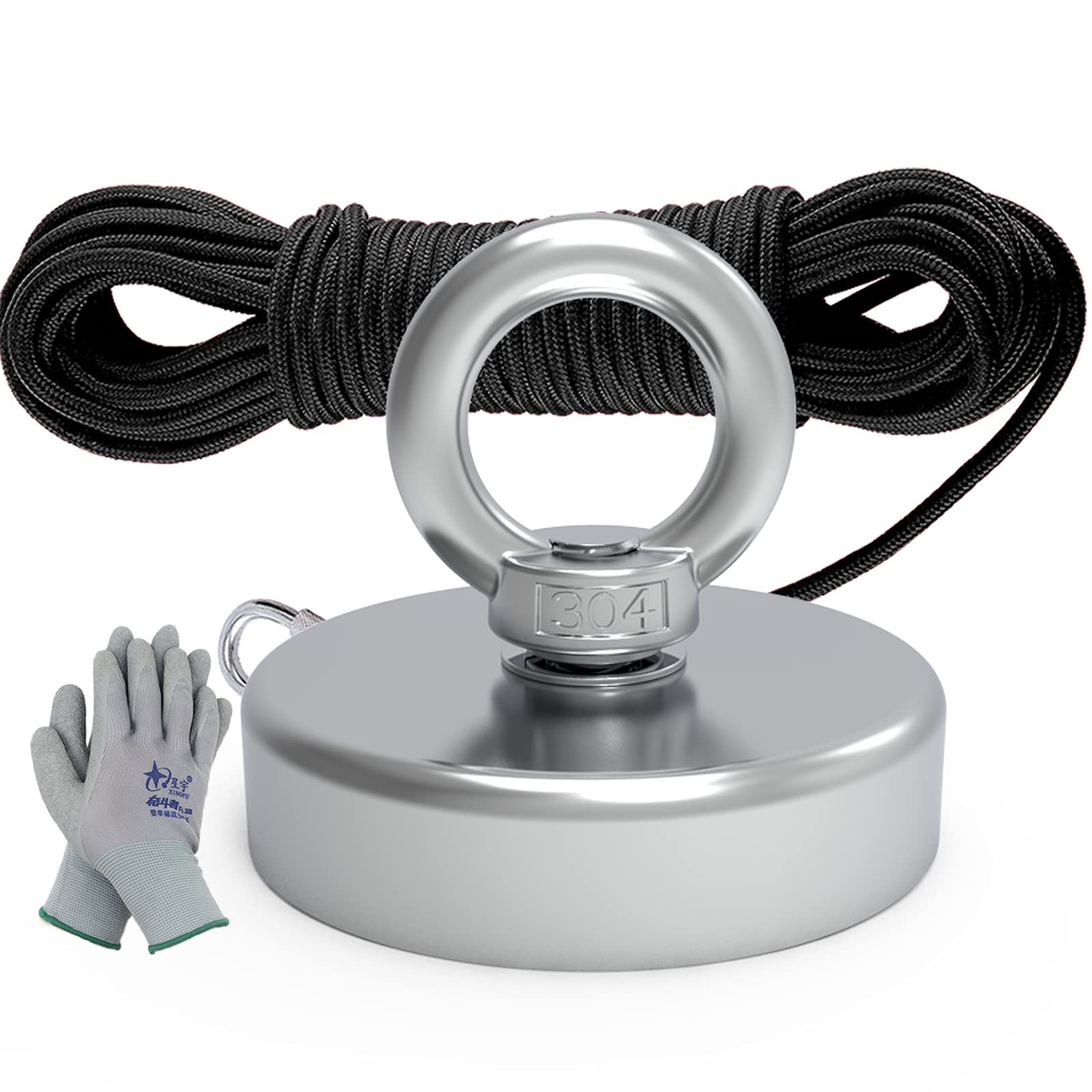 - Fishing MagnetThe fishing magnet is 2.95in diameter, the nylon rope is 1/4 in diameter and 65ft length, the gloves is free size. Fishing magnet is made of neodymium rare earth magnet with simple structure and Its strength is focus on the bottom of the magnet. Other surfaces no magnetic.