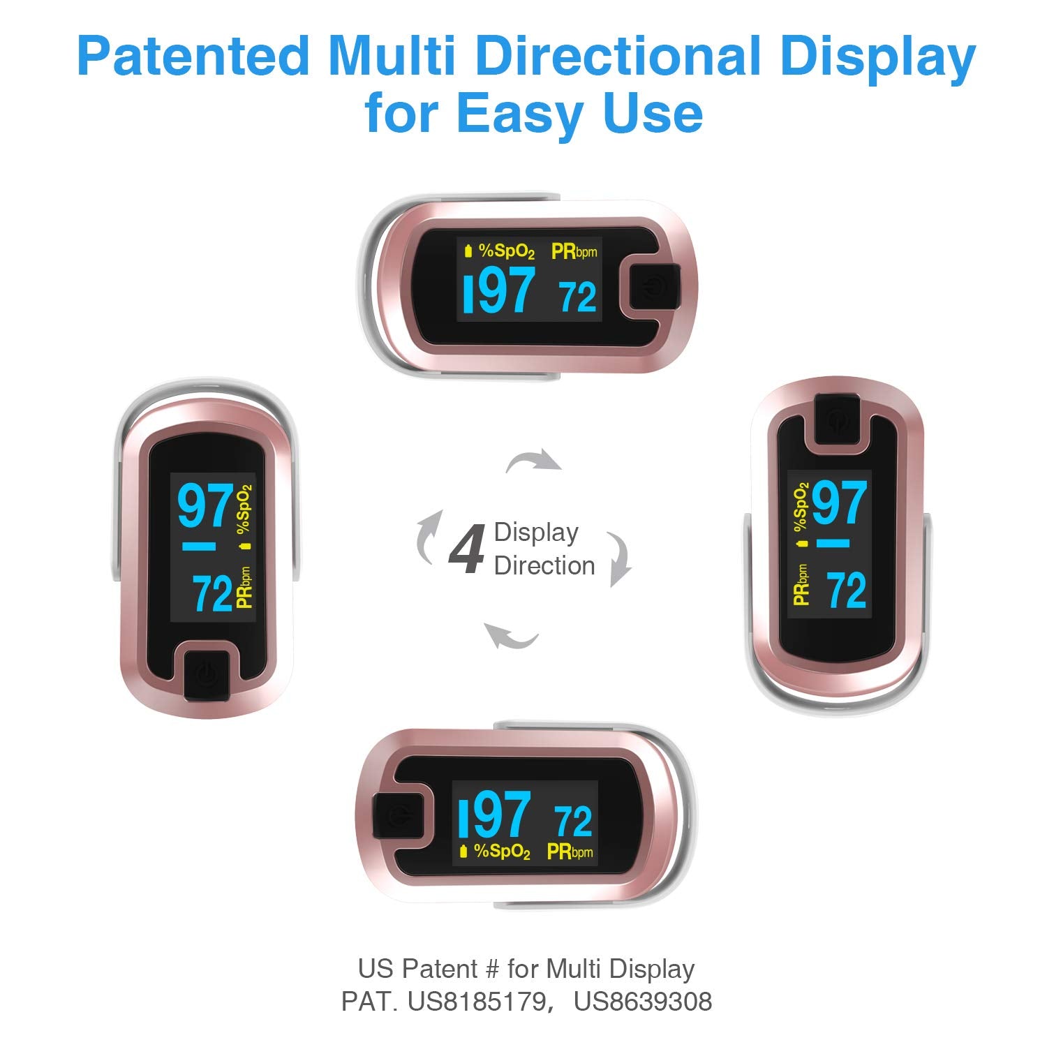 - LUXURY AND RELIABILITY: Our accurate dual color oximeter displays SpO2 in 4 directions, 6 display modes, and 10 levels of adjustable brightness. Comes with a battery-low indicator. Suitable for all ages