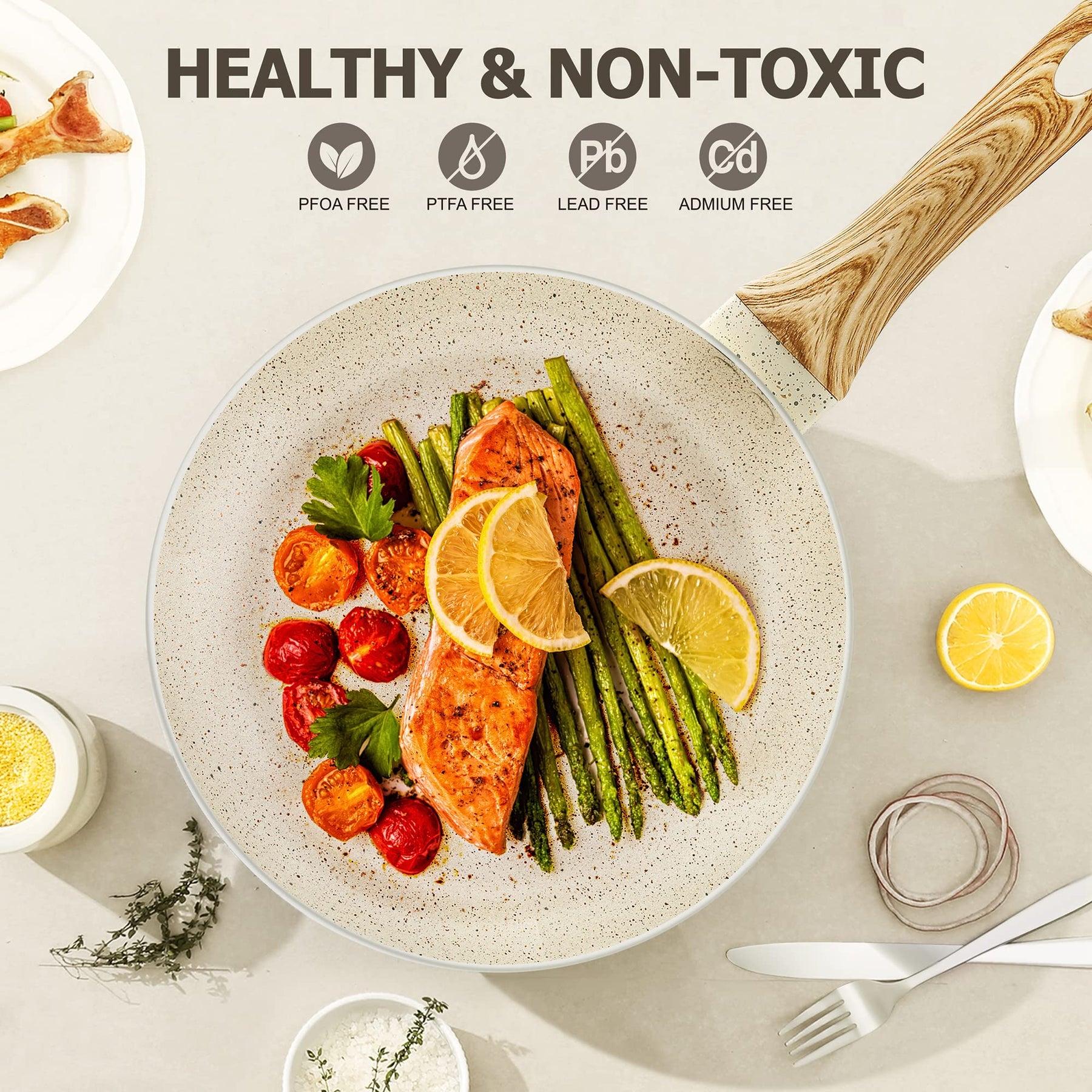 - Non Toxic & Cadmium Free - Our frying pan set is 100% PFOA, PTFE, lead and cadmium free, ideal for healthy cooking. Choose these nonstick granite frying pans set for greener and safer cooking!