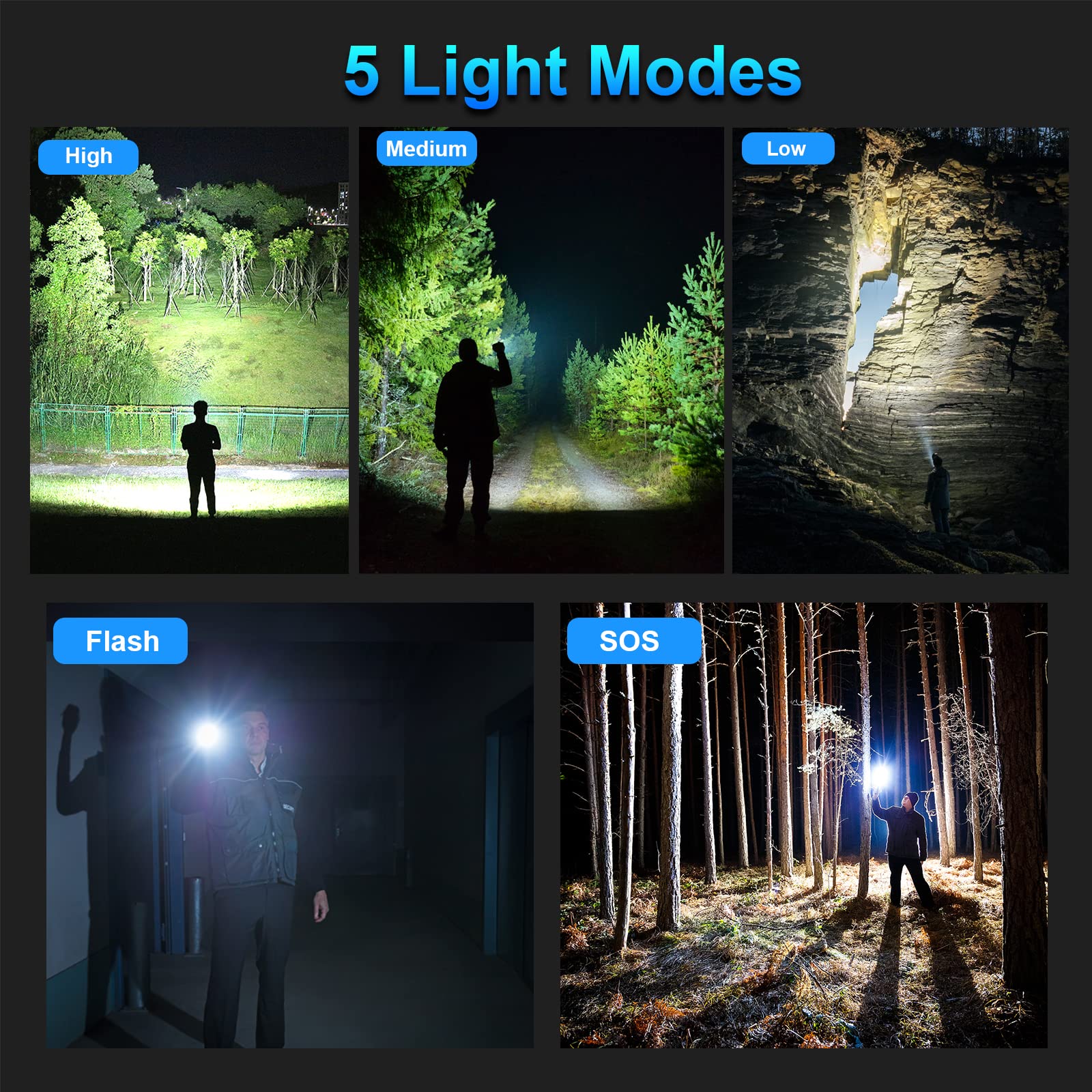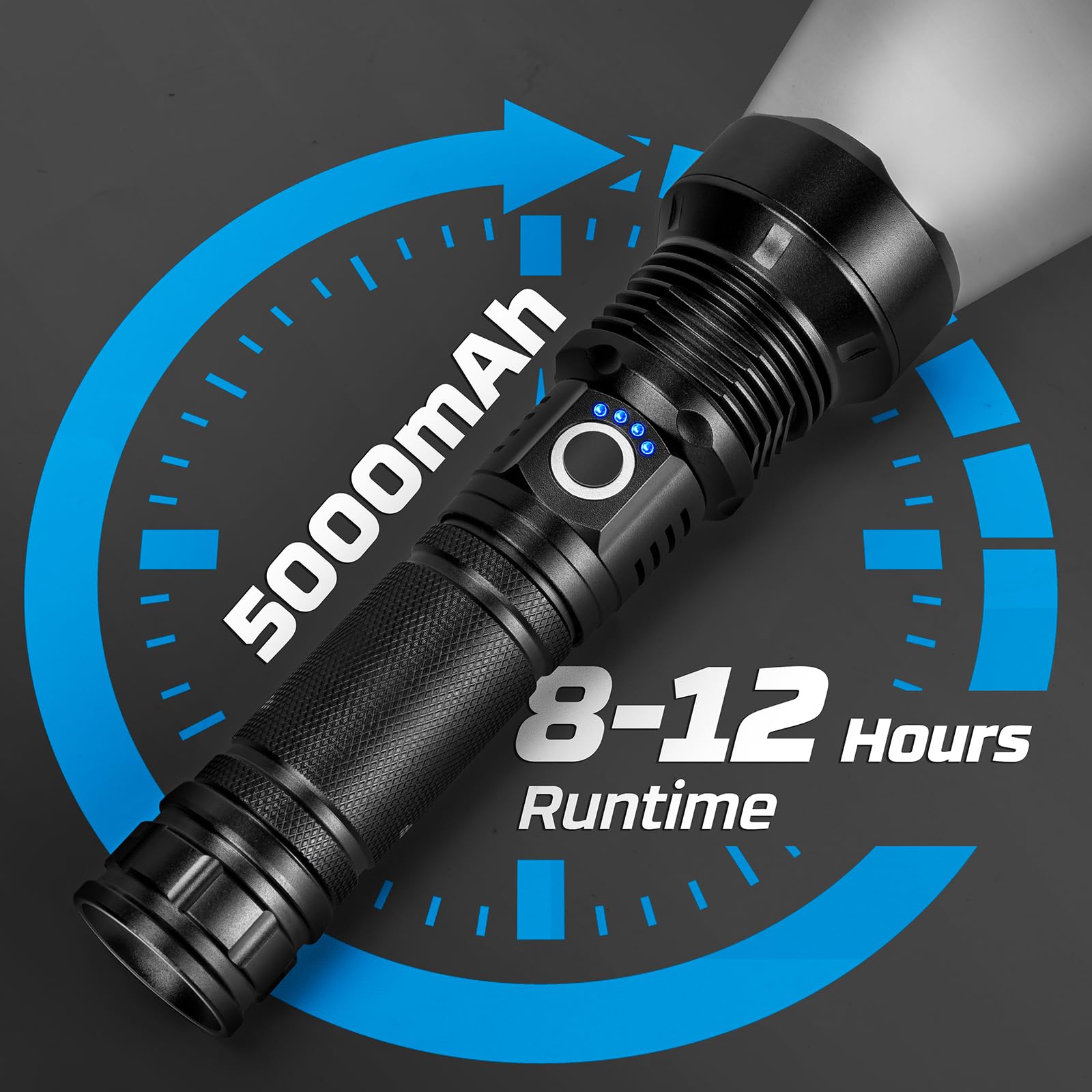 - 990,000 High Lumens FlashlightsThe super bright flashlight build in 5000 Ah rechargeable ATTERIES and adopts the latest XHP50LED bulb, the light is uniform, it is not easy to short-circuit after long-term work. The output power up to 990,000 lumens and the service life is as high as 10000 hours. The rechargeable flashlight has a range of up to 1650 feet, making it easy to light up your back garden.
