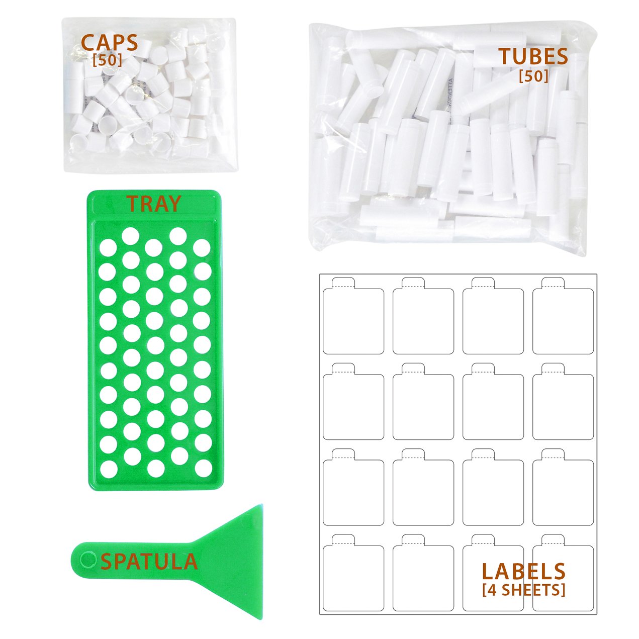 - Includes: Filling tray, spatula/scraper, 50 lip balm tubes, 50 tube caps, 64 labels and 50 Plastics. Filling tray measures: 10x4.5x0.6 inches. Standard tube holds .15 oz or 4.25 grams