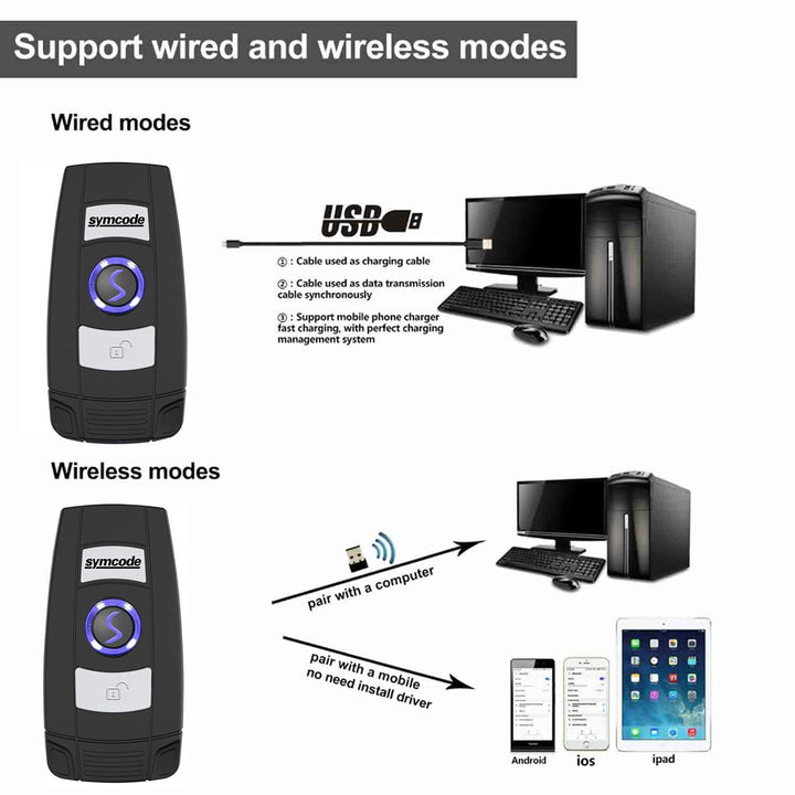 - Original Bar Code Scanners – Mini 2D Portable Handheld Bluetooth Barcode Scanner Wireless 2.4G & USB Wired 3-in-1 Bar Code Scanner Portable USB QR Code Scanner for Windows.Android.iOS.MAC by symcode