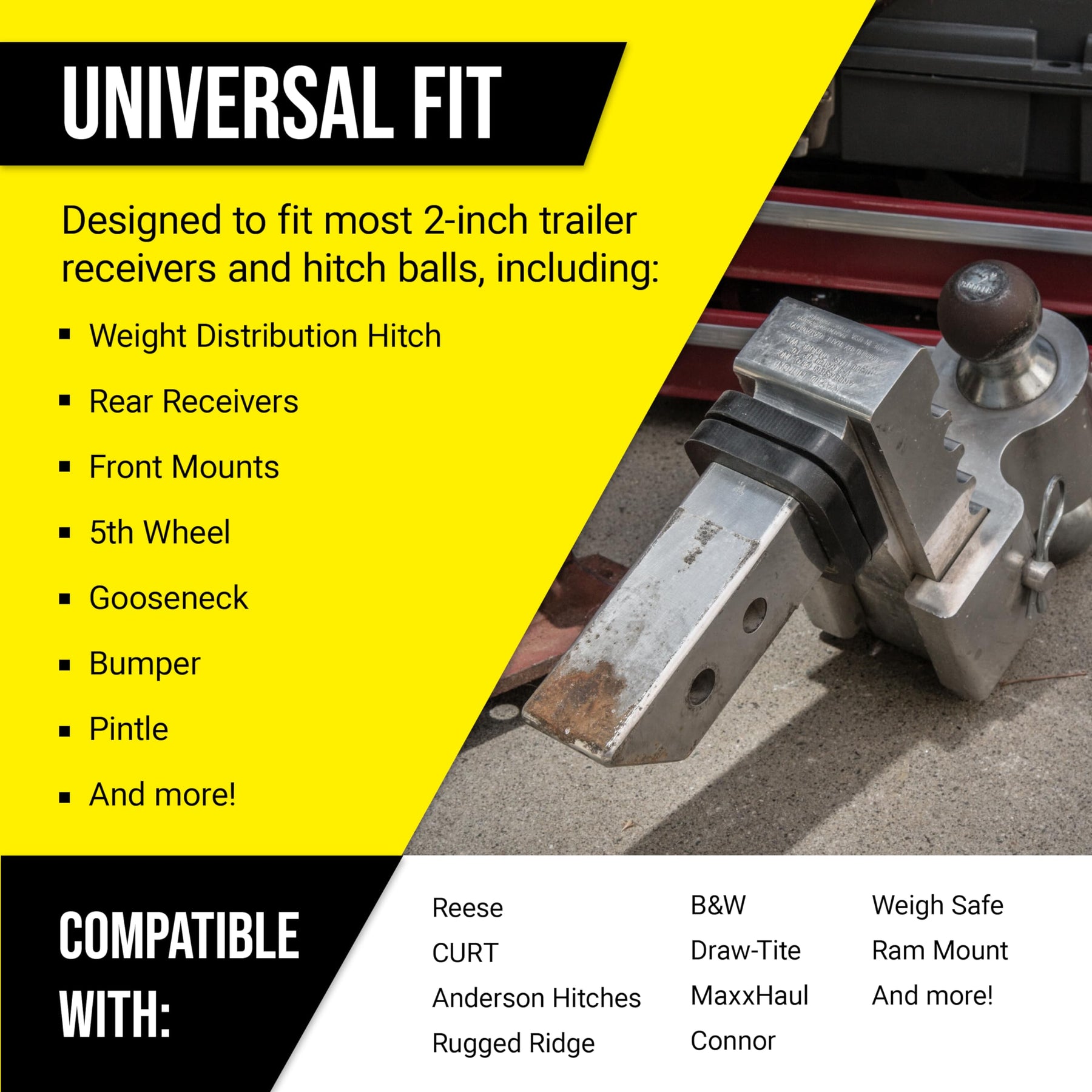 - Fits Most 2” Tow Mounts: The silencer pad acts as a universal cushion for most 2” trailer receivers and hitch balls such as: Rear Receivers, Front Mounts, 5th Wheel, Gooseneck, Pintle, Bumper, Weight Distribution Hitch and more.