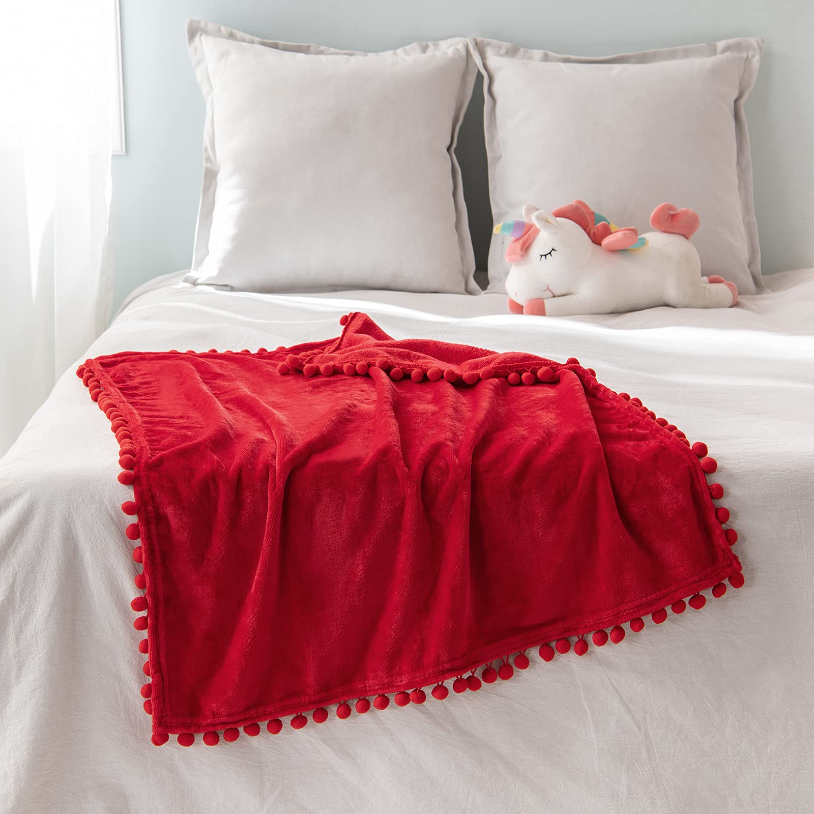- WHAT YOU CAN GET: Package includes one piece of 50x60 cream white throw blanket. Made of soft fleece microfiber with pompom fringe.