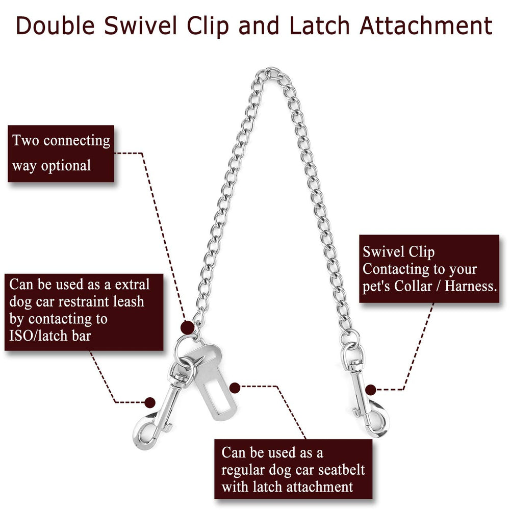 - MULTI-CONNECTING WAY: double swivel clip and latch attachment design,you can connect it to your car's regular with the nap OR you can connect it to latch bar in your cars back seat creases as a extral pet tether.so the passager and your pet can use the in the same time without influence.
