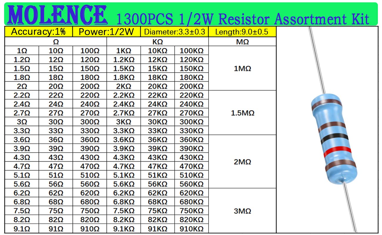 - Original Single Resistors – 130 Values 1300PCS Resistor Kit 1/2W 1% Metal Film Resistors 1 Ohm-3M Ohm Assortment Kit for DIY Projects and Experiments by Molence