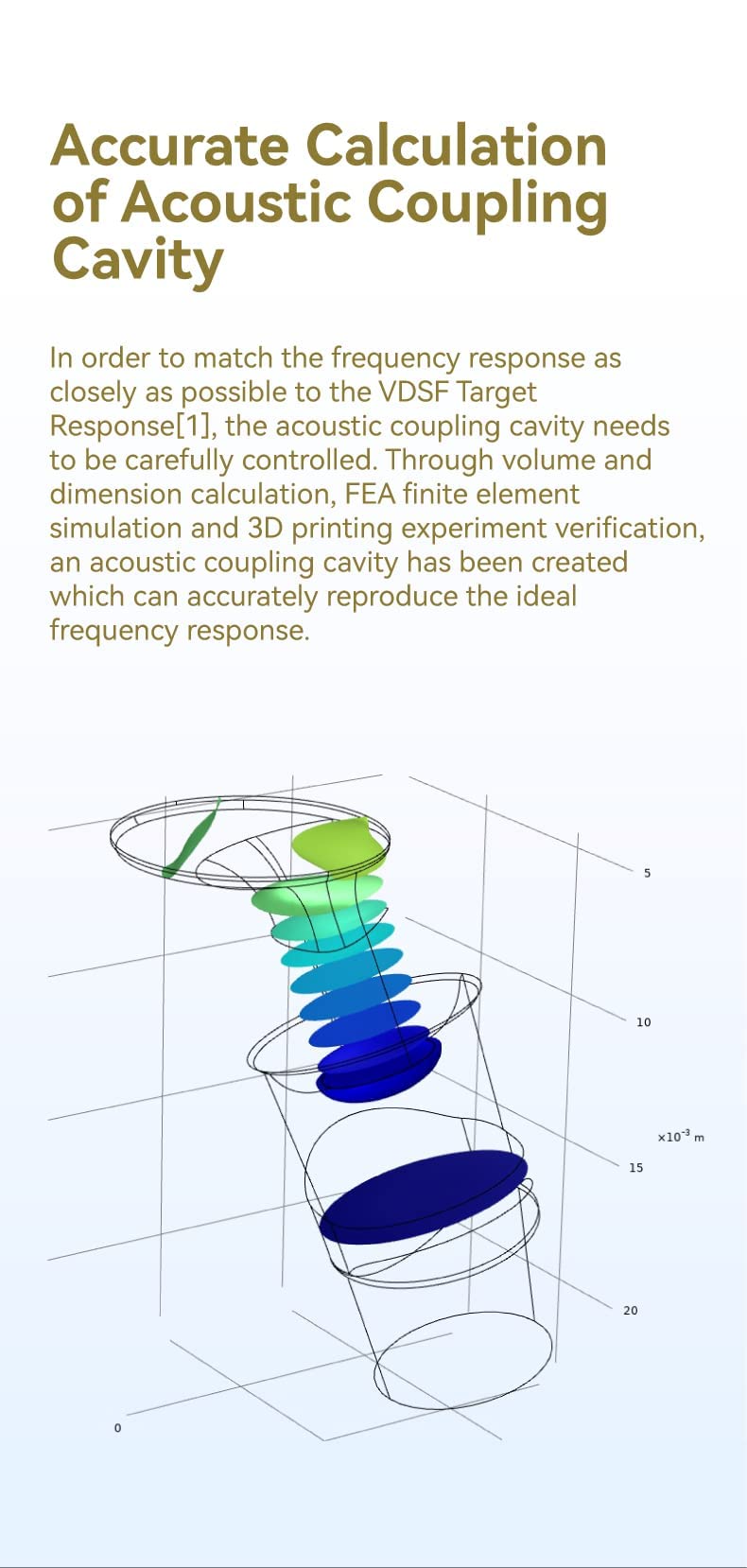 - Accurate Calculatioof Acoustic Coupling Cavity:In order to match the frequency response as closely as possible to the VDSF Target Response, the acoustic coupling cavity needs to be carefully controlled. Through volume and dimension calculation, FEA finite element simulation and 3D printing experiment verification, an acoustic coupling cavity has been created which can accurately reproduce the ideal frequency response.