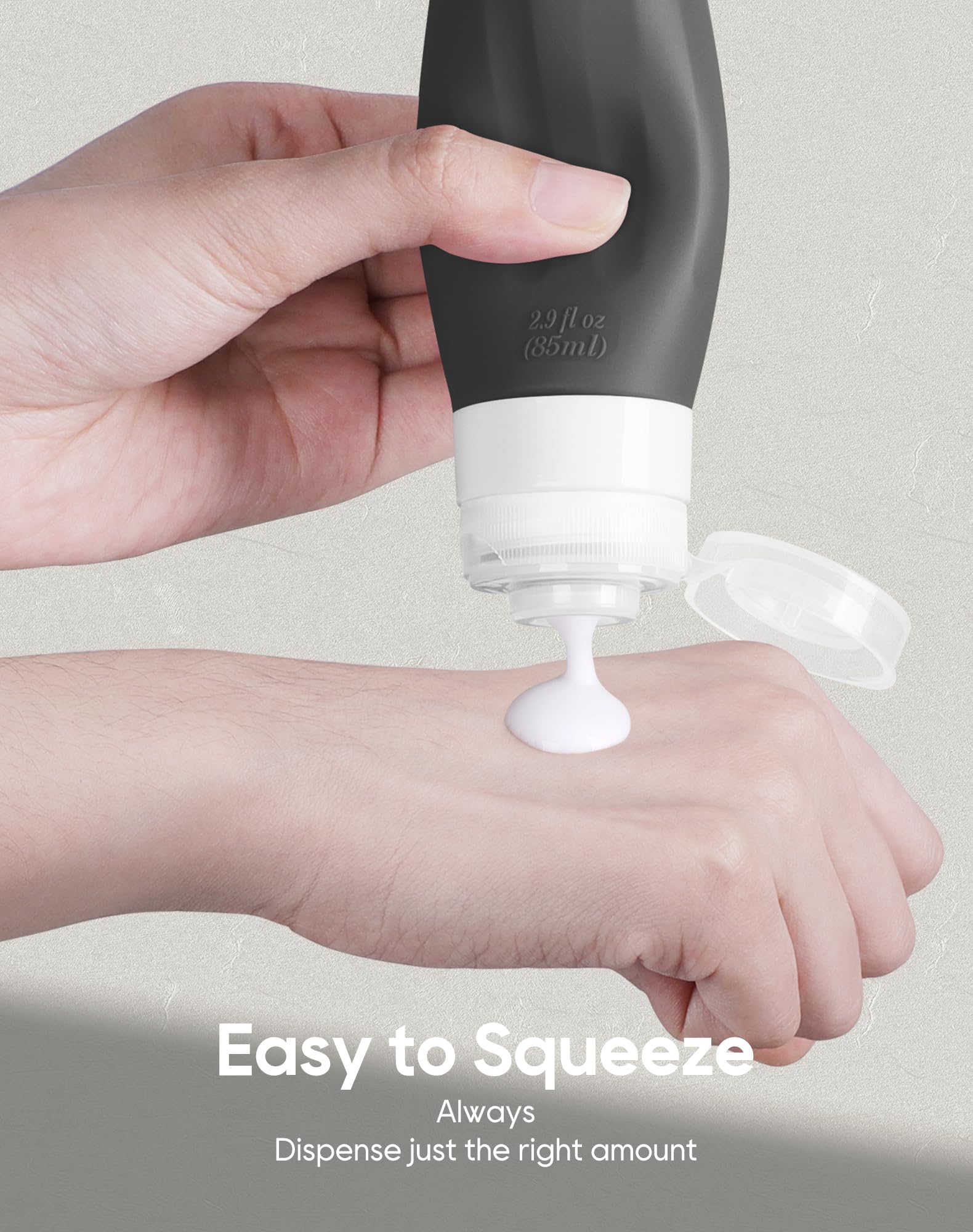 - SAFE SILICONE MATERIAL: Made of Food Grade BPA Free Silicone, this travel set is sturdy, soft, squeezable, flexible and reusable. Safe material guarantee that you can not only use them to store shampoo, conditioner, face soap, sunscreen, creams, lotion or etc, but also safe for food, various seasonings. Soft silicone body make you squeeze out contents easily