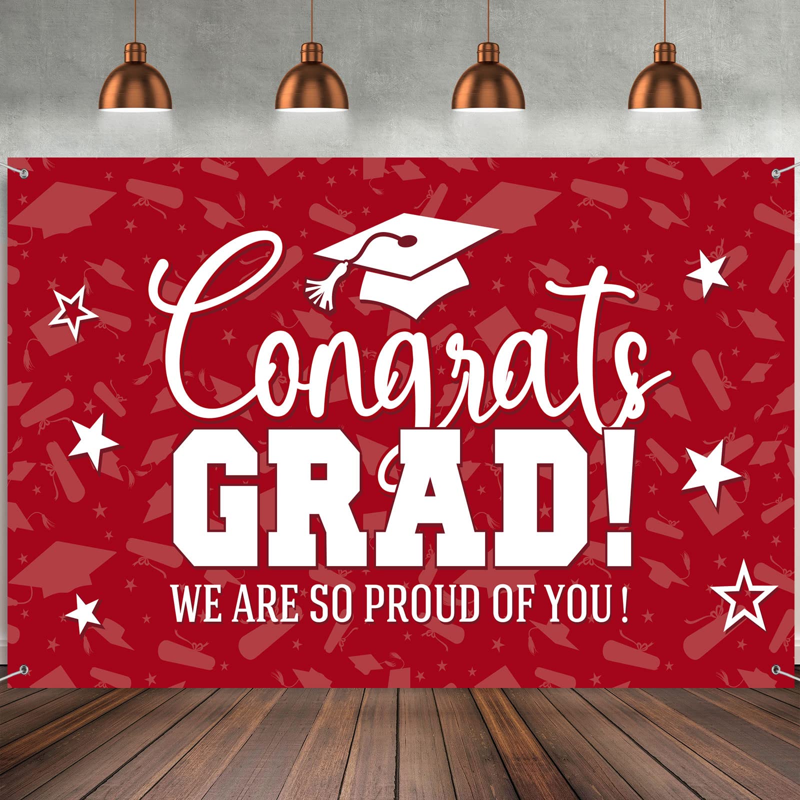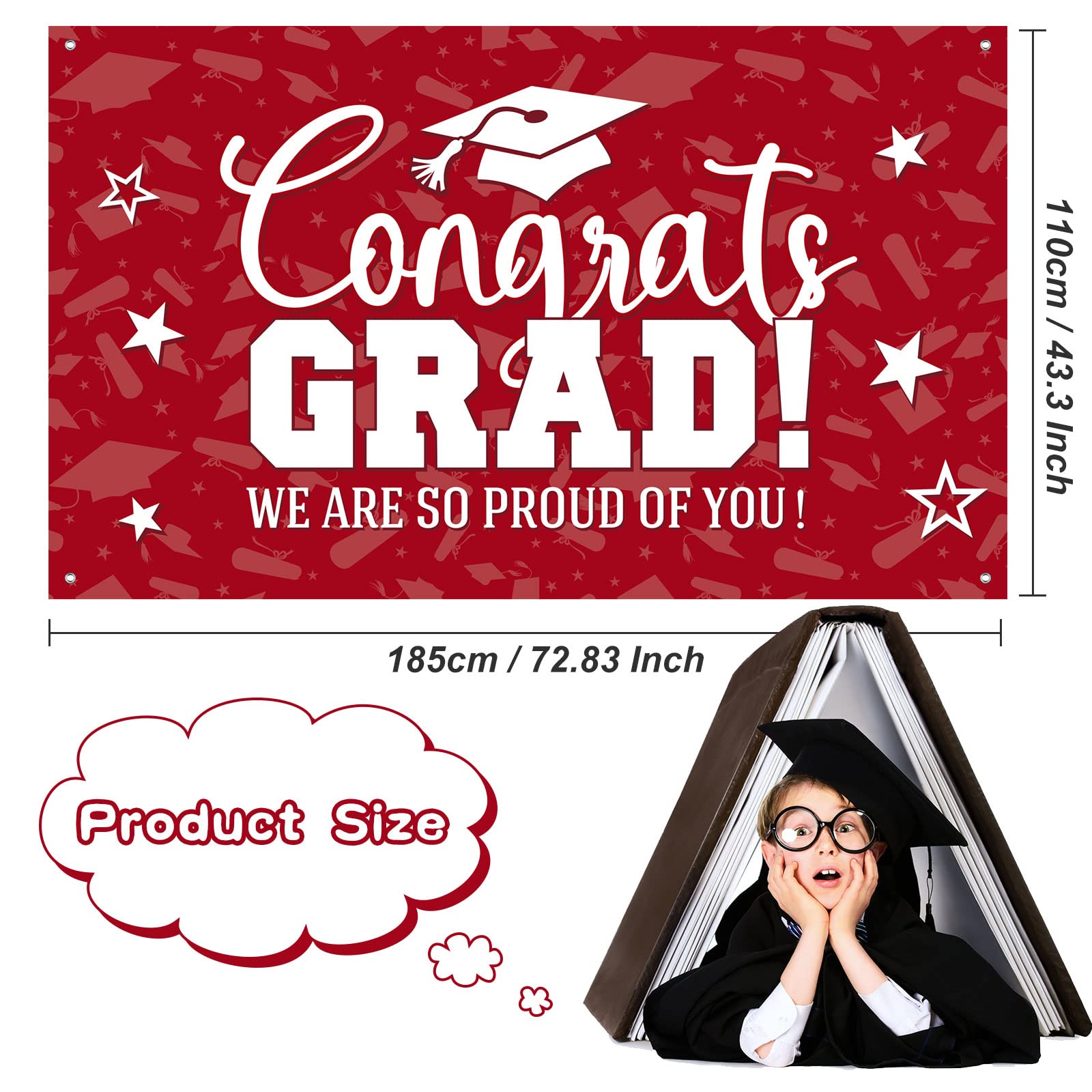 - Graduation party decorations: the graduation background is well designed with congrats grad letters and vibrant patterns, printed with [congrats grad] [we are so proud of you] words, graduation cap and stars, etc, filled with pleasant atmosphere and precious meaning, It will give you and your guests a deep impression and an unforgettable experience