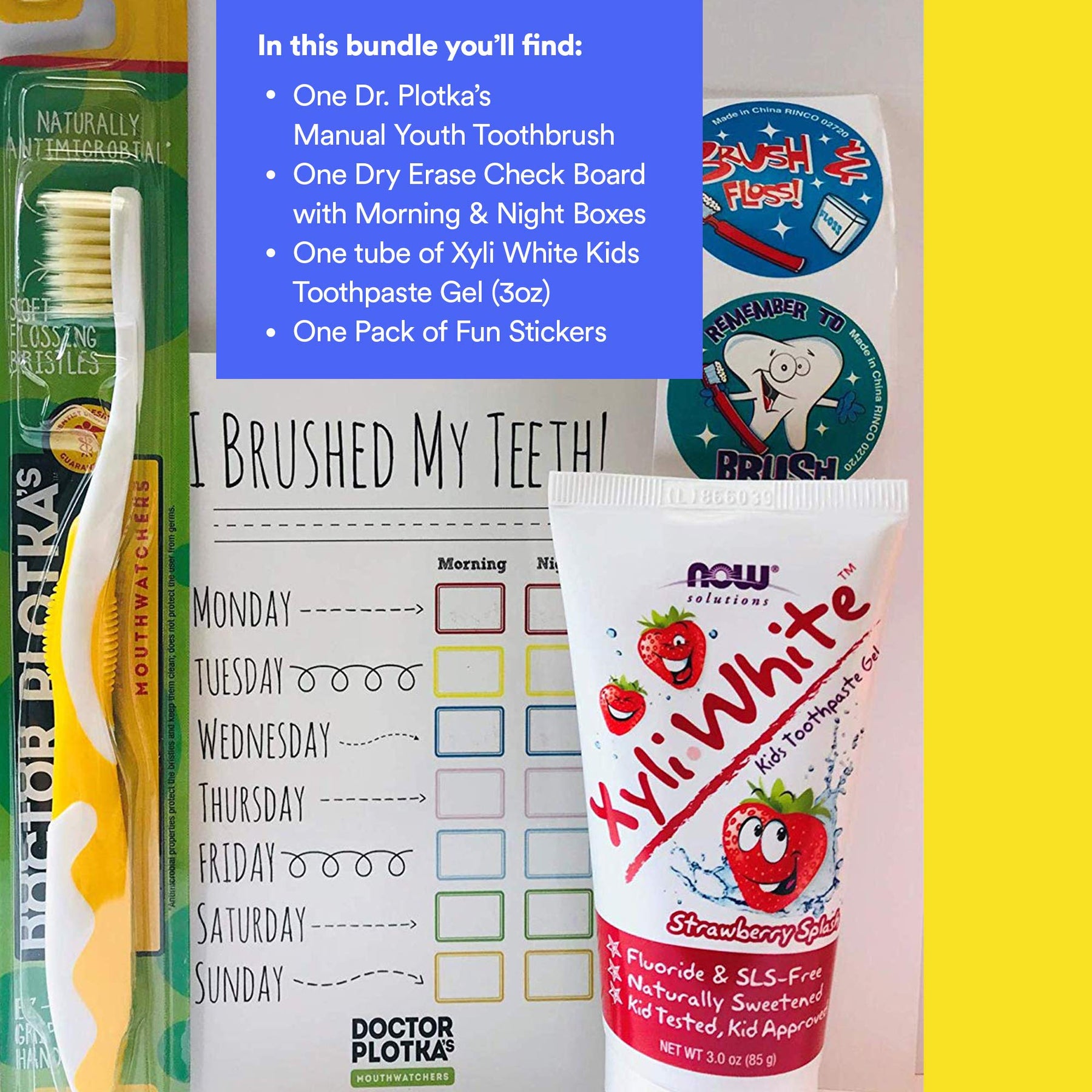 - Original Dental Care Kits – Mouthwatchers Doctor Plotka's Youth Yellow Antimicrobial Floss Bristle Silver Toothbrush, Toothpaste, Check Card, and Stickers, Children's Gift Pack by MOUTHWATCHERS