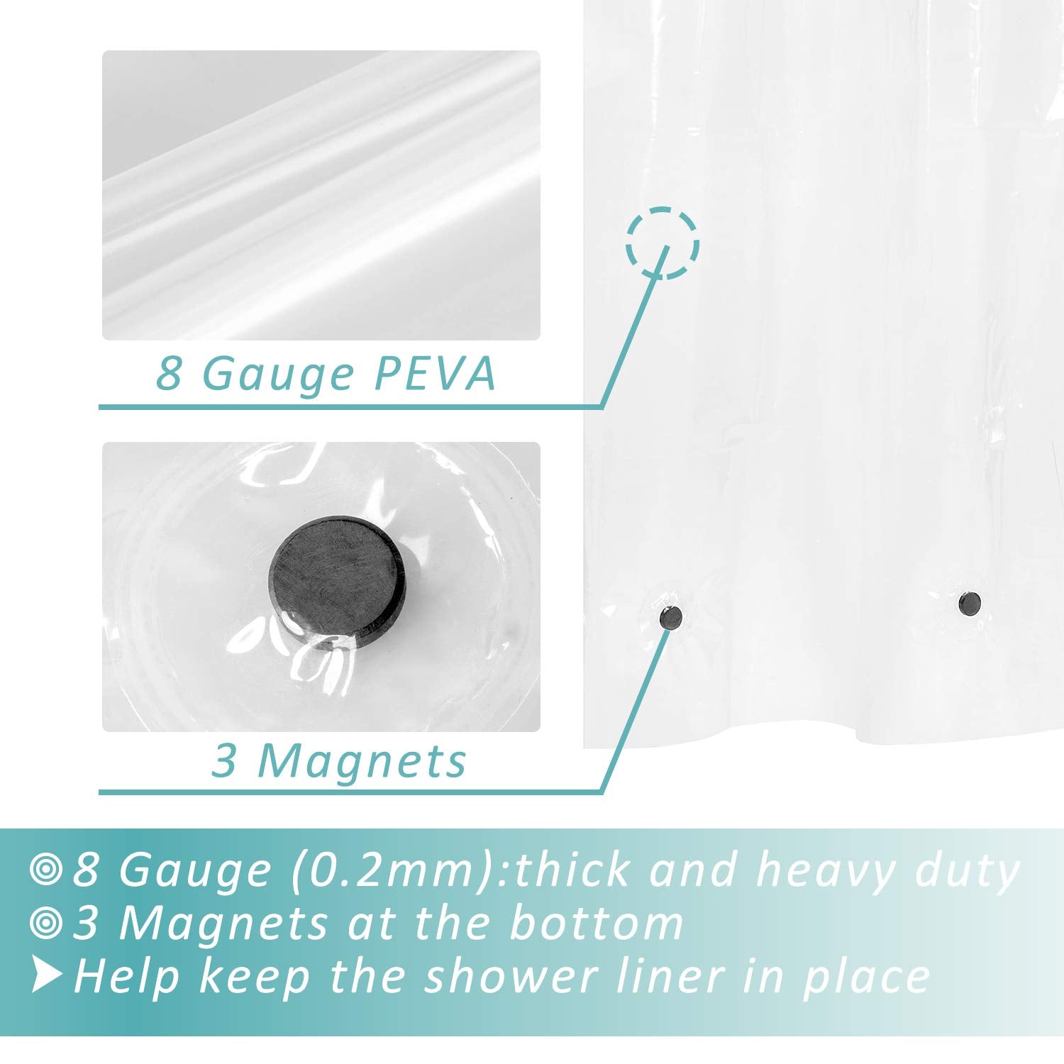 - *Encased magnets: Comes with 3 magnets at the bottom, especially good for cast/iron bathtub, in respect that it's easy to stick to the tub and keep the liner from blowing or clinging to body