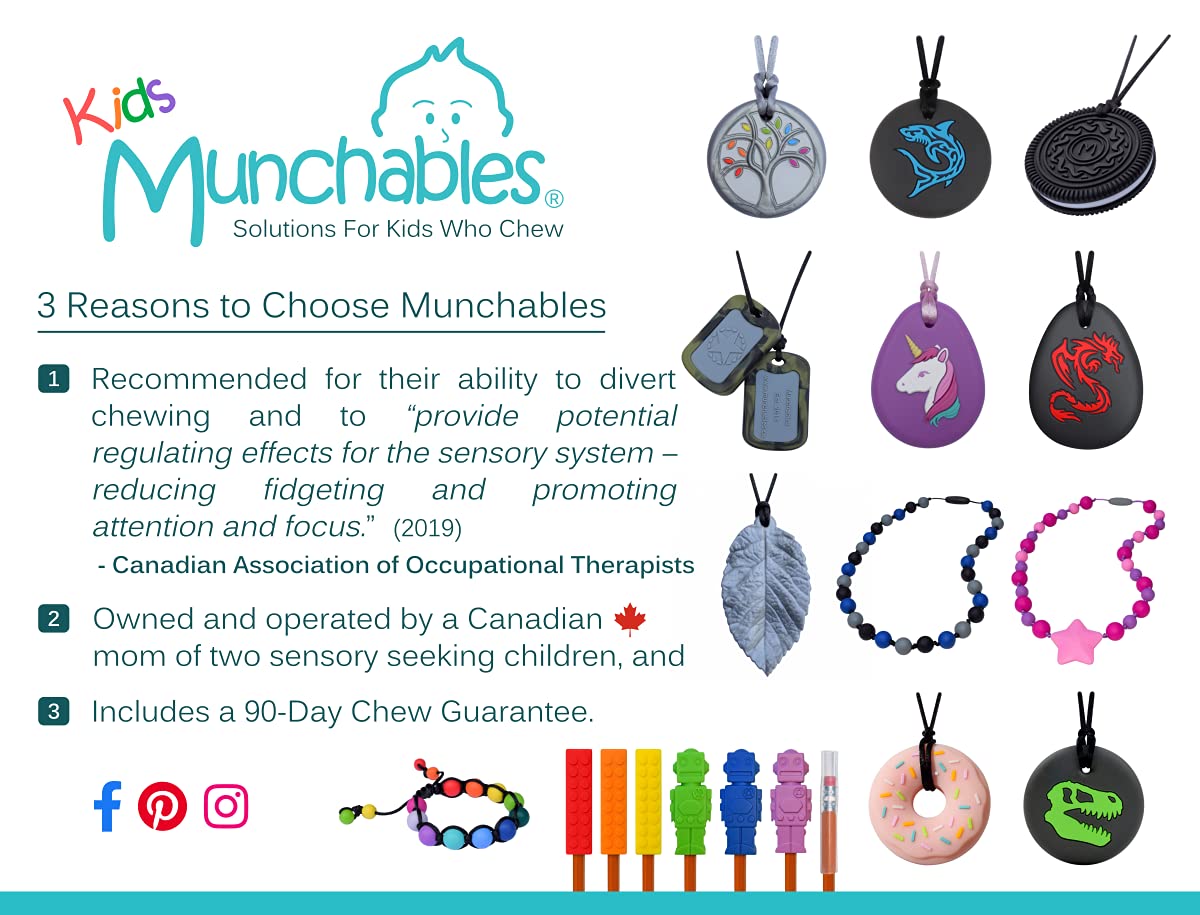 - Offers peace of mind. As a Canadian based company, we understand how important safety is. Munchables are made of just child-safe silicone - no BPA, BPS, or any other chemicals are found in our products. We know - Munchables have been thoroughly safely tested.
